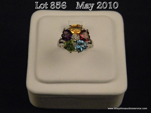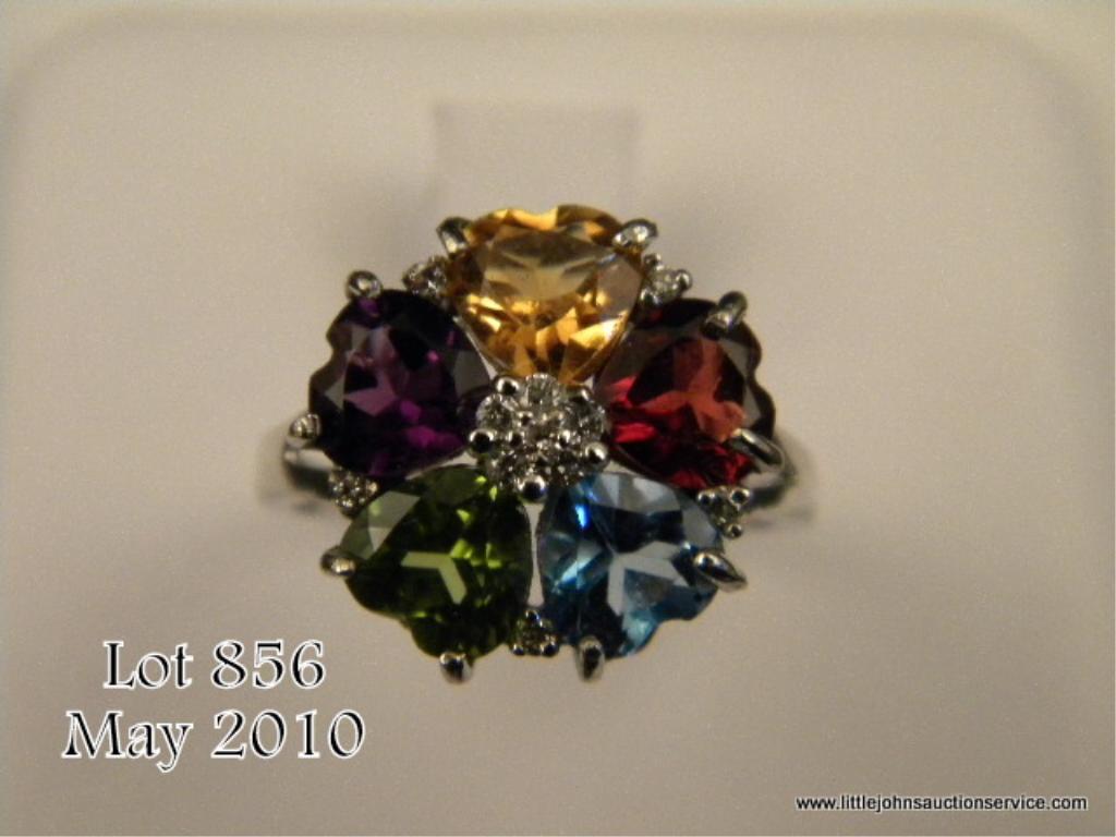 Elegant 14 karat white gold ladies flower design ring set with a combination of fine diamonds, amethyst, citrine, garnet, peridot and blue topaz weighing approx. 4.00 carats. Retail $850.00 Estimate $200-$400