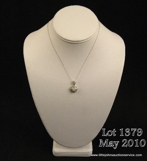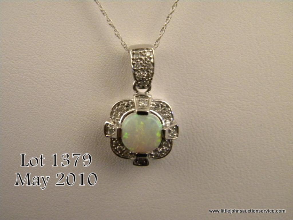 Elegant 14 karat white gold ladies pendant set with a center fine opal weighing approx.1.00 carat and pave set with 23 round diamonds weighing approx. 0.25 carats of G-H colors and SI clarity. Retail $1,250.00 Estimate $300-$600 A nice item