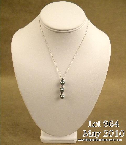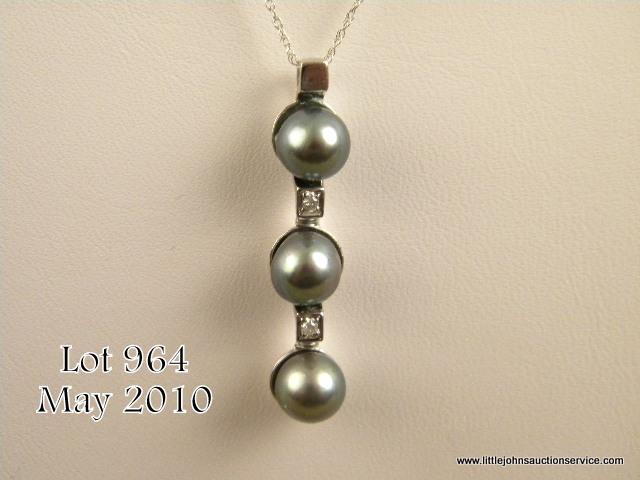 Elegant 14 karat white gold ladies pendant set with three round gray/black pearls averaging 7.00 mm in diameter and side pave set diamonds. Retail $1,150.00 Estimate $300-$400 A nice item