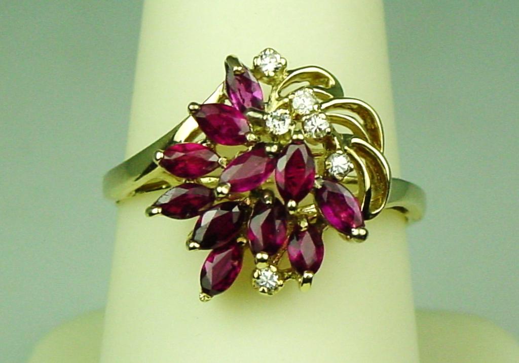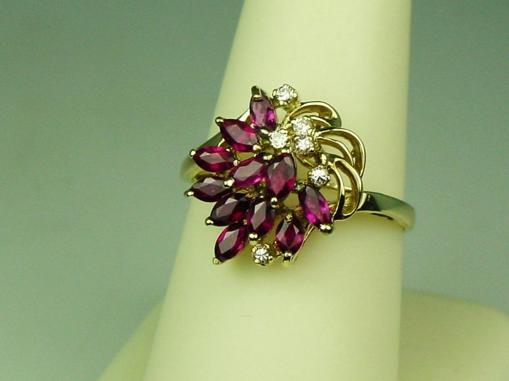 Elegant 14 karat yellow gold ladies cluster/freeform design ring set with 11 MQ shape blood red rubies and six side diamonds with a total weight of approx. 2.00 carats. $1,650.00 Estimate $400-$800