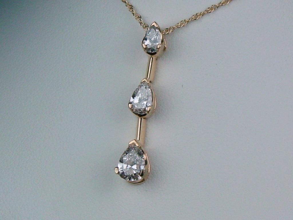 Elegant 14 karat yellow gold ladies custom made pendant set with three graduating pear shape diamonds weighing approx. 1.00 carat of H-I colors and SI clarity. Retail $2,500-$3,000 Estimate $1500-$2,000