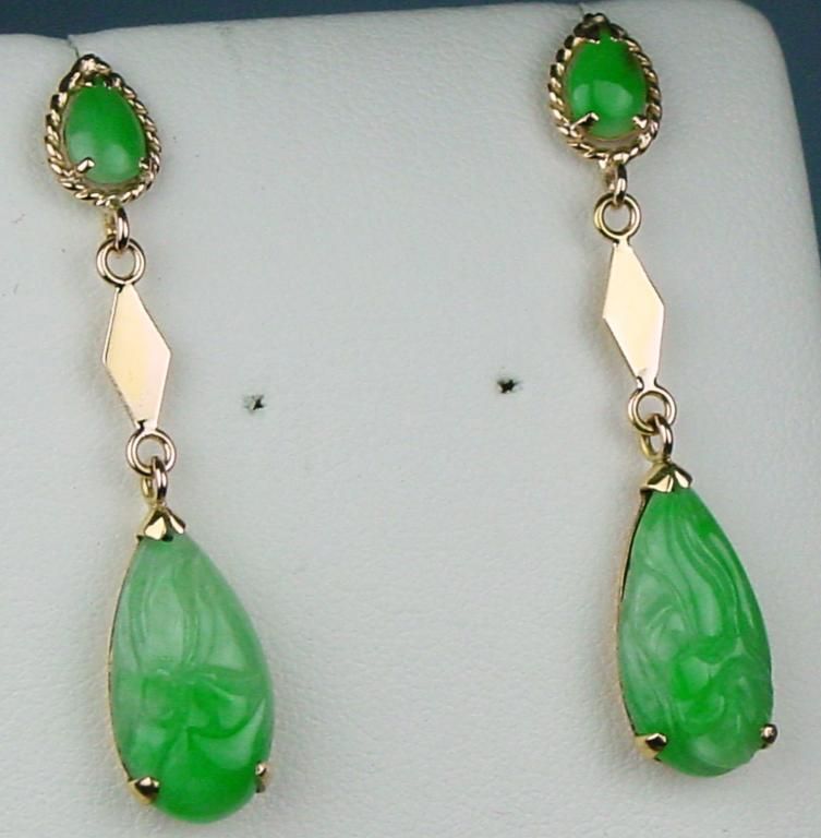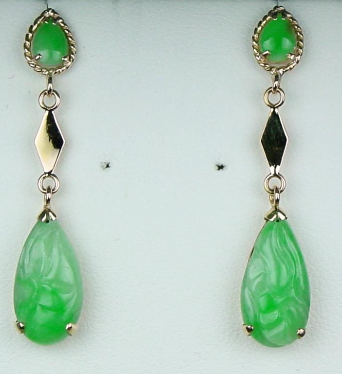 Elegant 14 karat yellow gold ladies drop earrings set with four matching nice green Jade weighing approx. 6.00 carats. Retail $1,000-$1,200 Estimate $600-$900