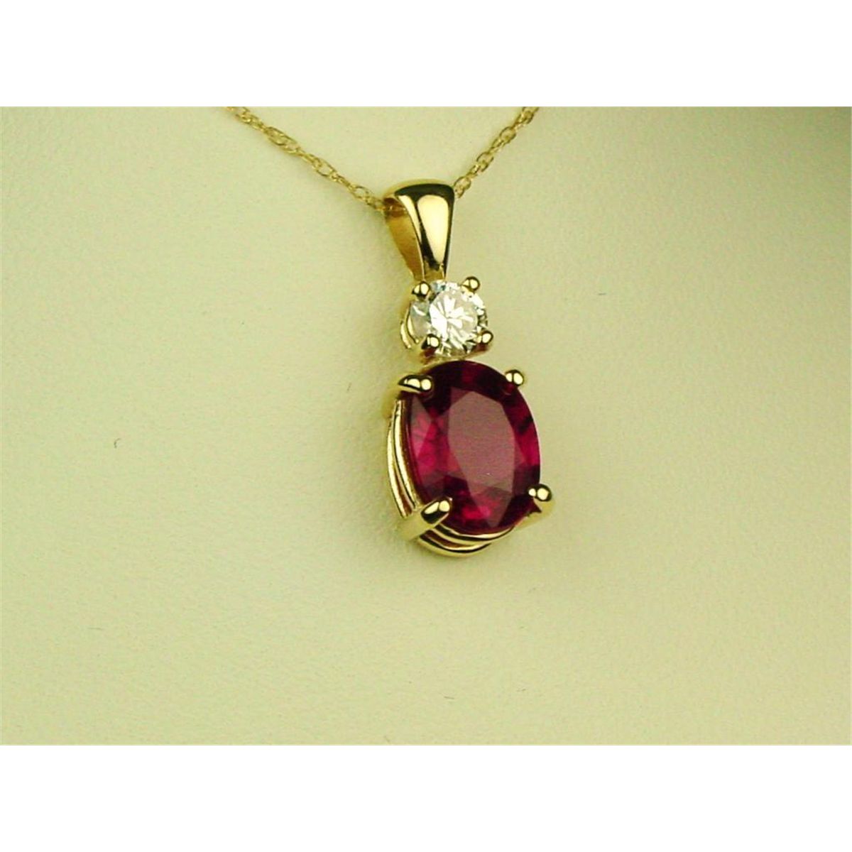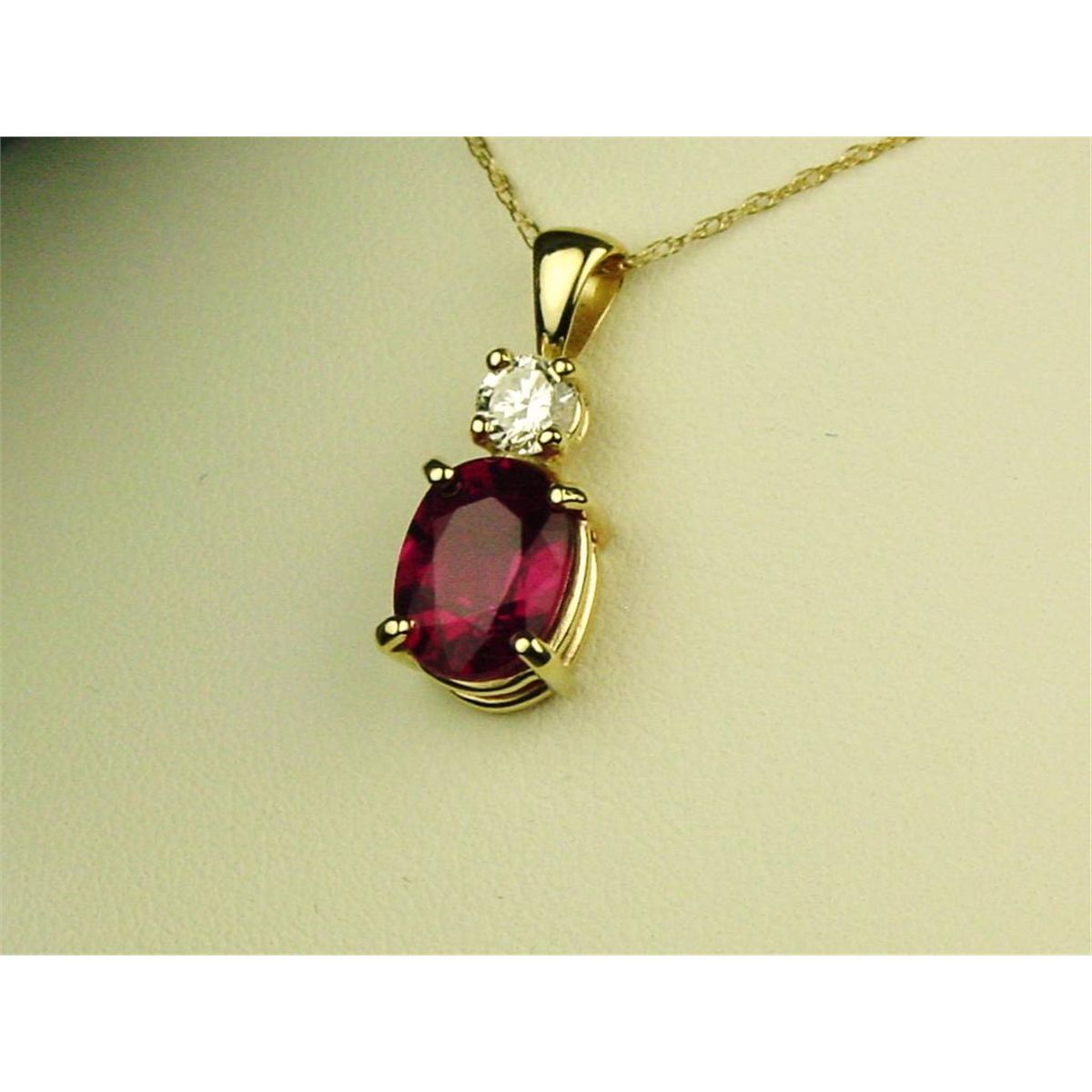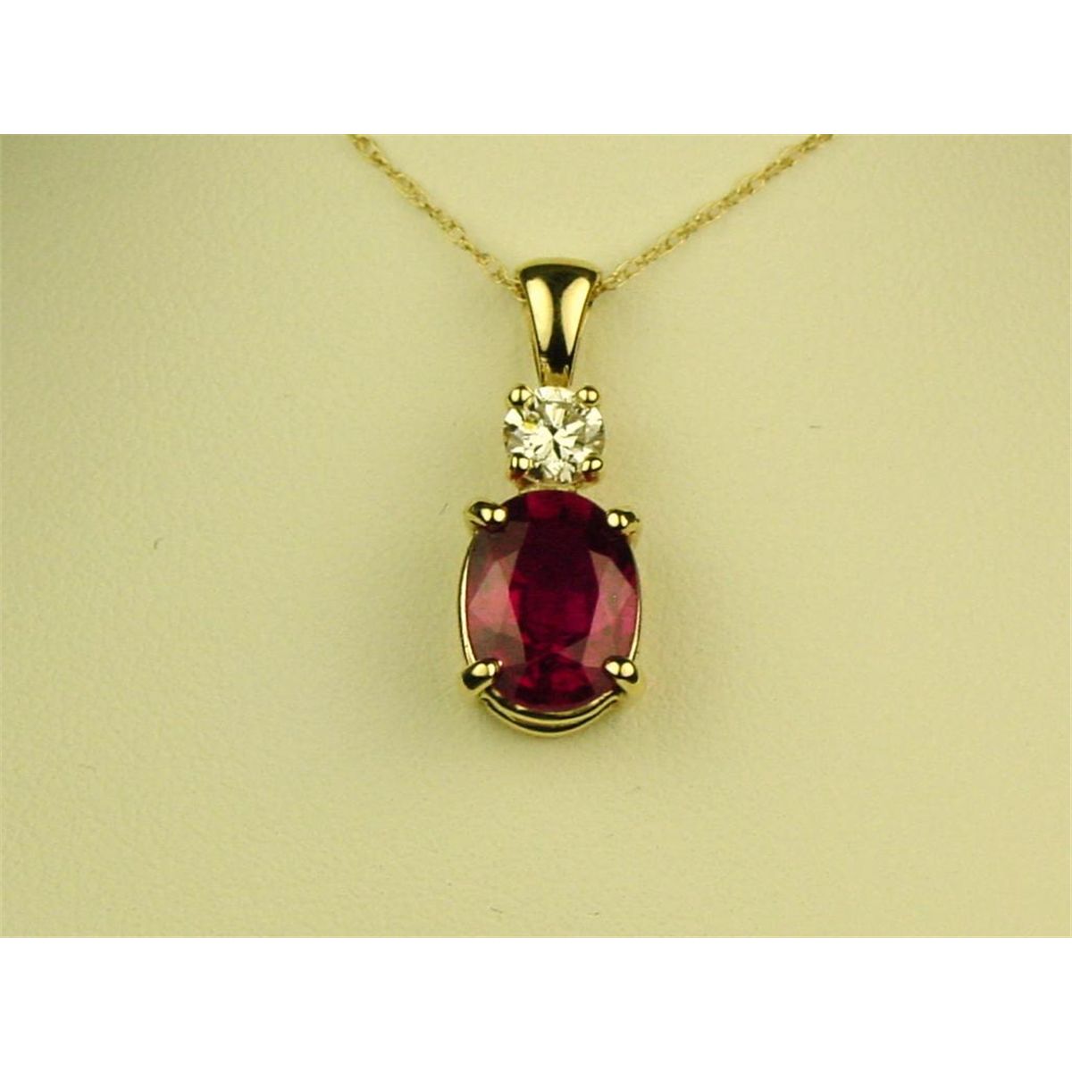 Elegant 14 karat yellow gold ladies handmade necklace fine set with an oval red Ruby weighing 2.90 carats and side diamond weighing 0.33 carats of F-G color and SI clarity. Retail $2,750.00 Estimate$1,500-$2,000 Nice