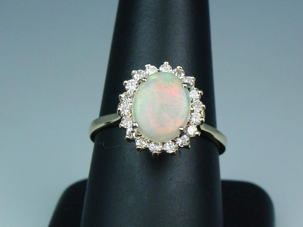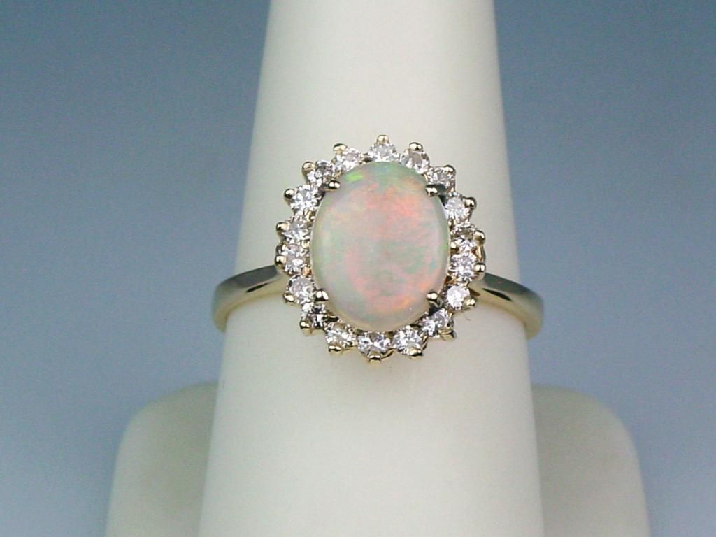 Elegant 14 karat yellow gold ladies ring set with an Australian opal weighing approx. 3.00 carats and surrounded by 18 round brilliant cut diamonds weighing approx. 0.50 carats of H-I colors and VS/SI clarity. Retail$2,000-$2,500 Estimate $800-$1,200 Nice