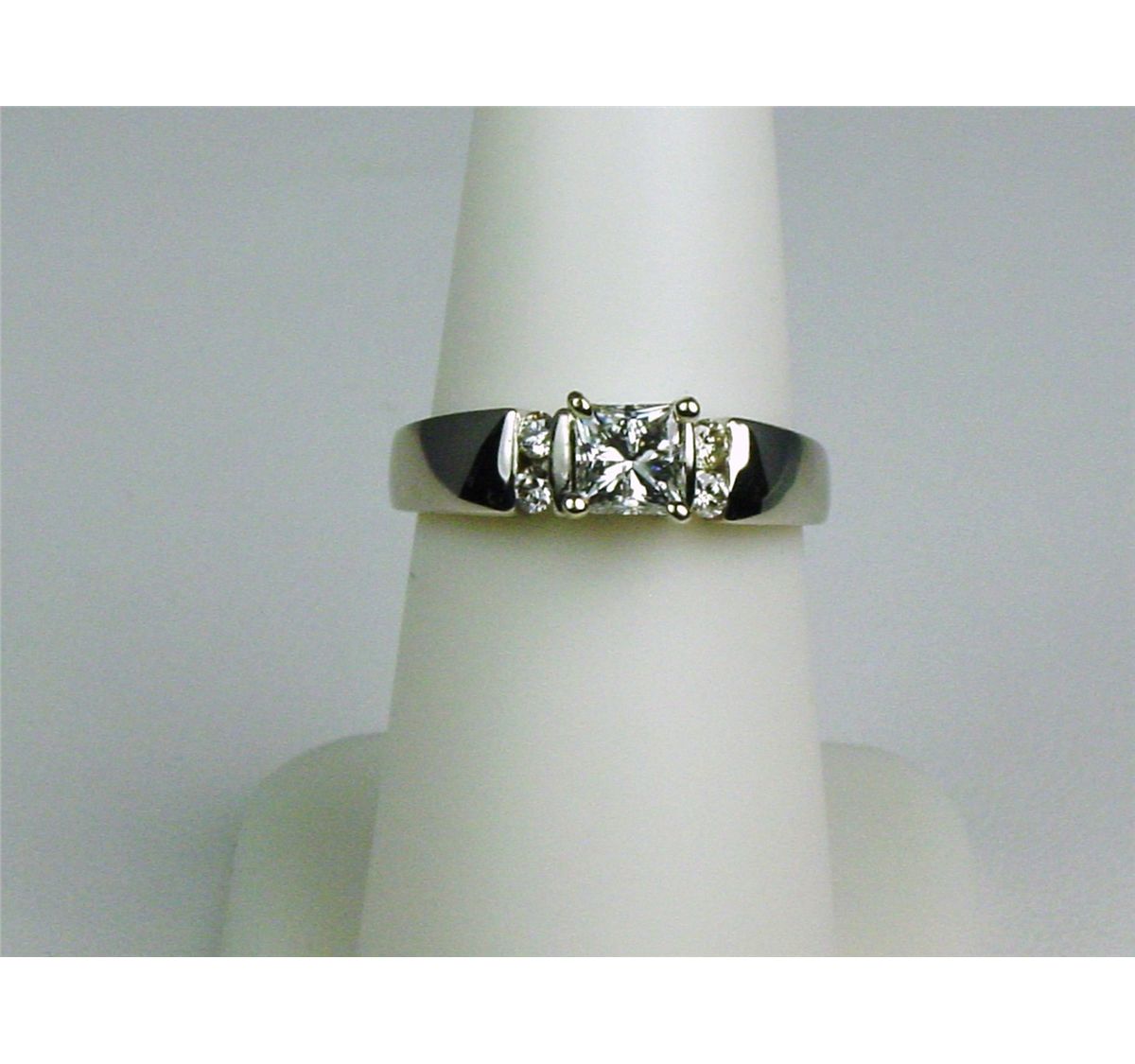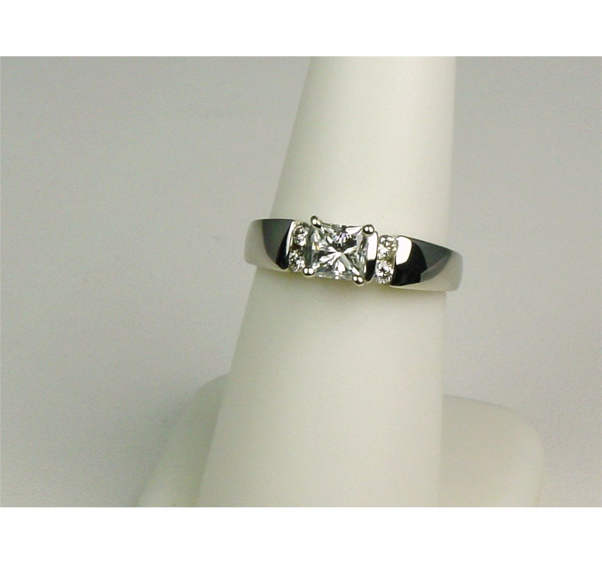 Made by "SHANE CO", set with a center princess cut diamond weighing 0.74 carats of F-G color and SI/I clarity and 4 channel set diamonds. Retails $3,000-$4,000.
