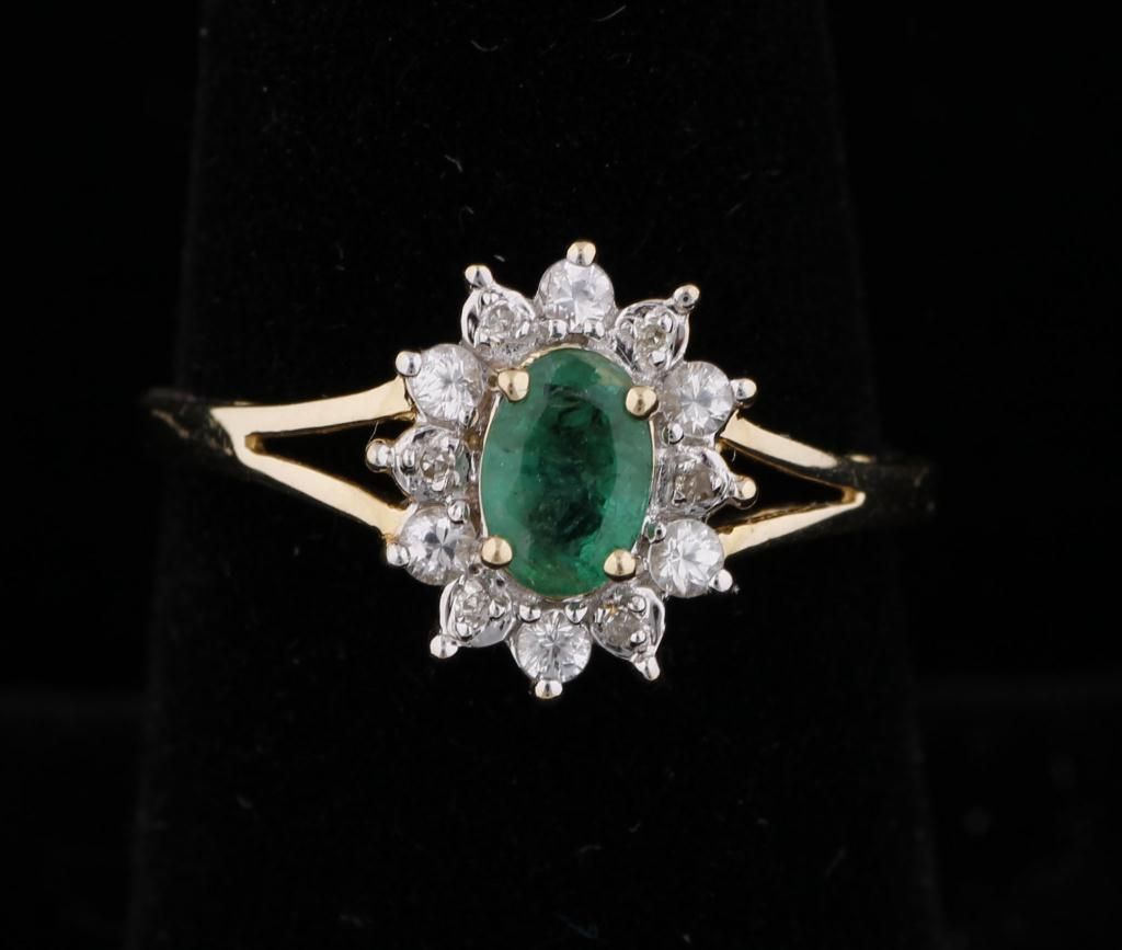 Features a 0.5 carat emerald surrounded by 12 diamonds of G-H and SI quality with a total of 0.2 carat diamond weight, size 7, weighs 2.1 grams.