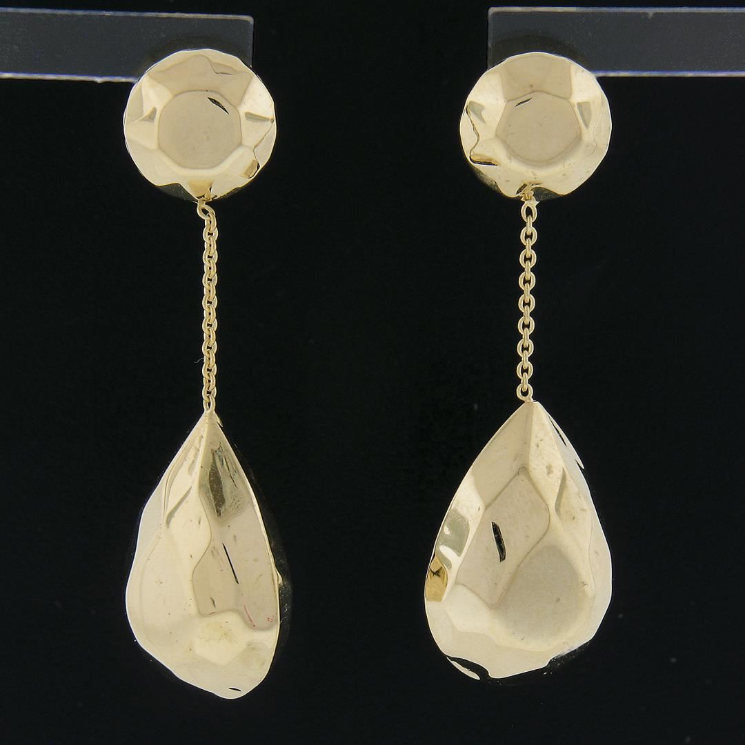 A solid 14k yellow gold dangle drop earrings. The earrings measure approximately 40.1x13.3mm and weigh a total of 4.24 grams.