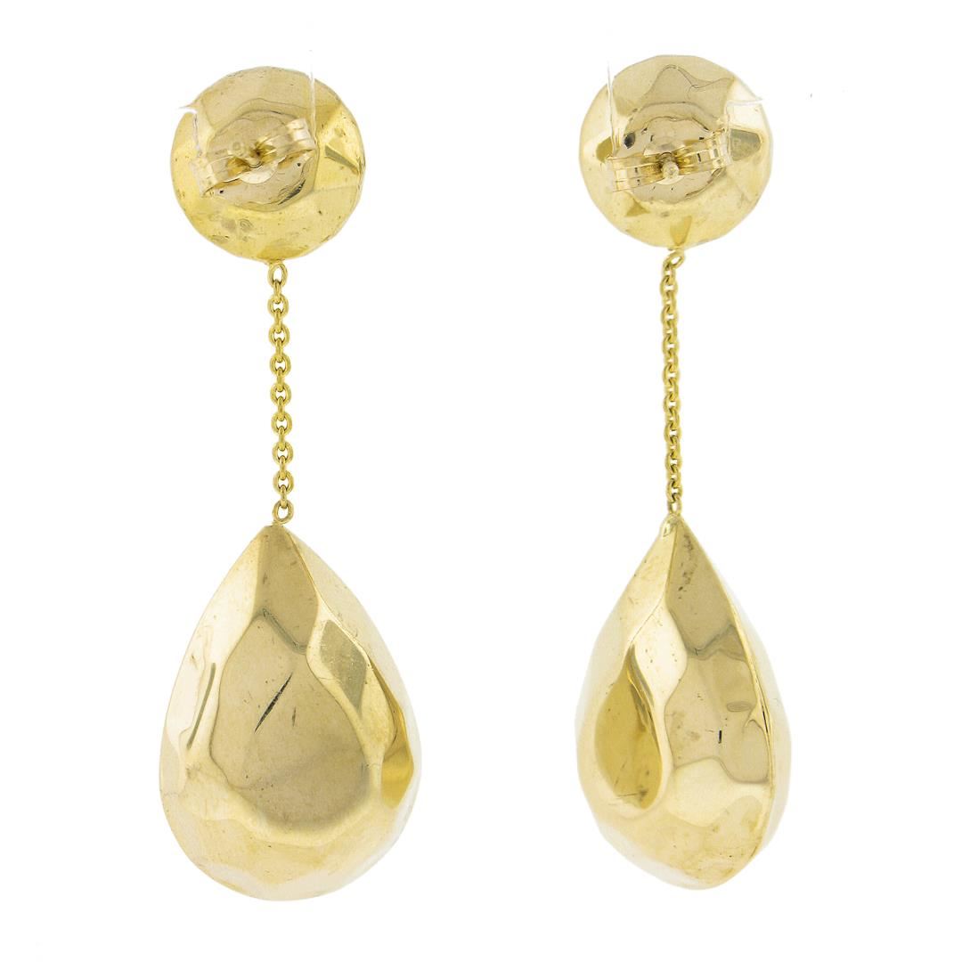 A solid 14k yellow gold dangle drop earrings. The earrings measure approximately 40.1x13.3mm and weigh a total of 4.24 grams.
