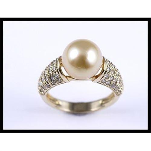 Elegant ring with 1 golden south sea pearl (10.2 millimeters) and 50 full cut diamonds that weigh approximately 1.00 carat set in 14K yellow gold. The size 6-3/4 ring measures 6.3 millimeters (0.25 inches) wide and weighs 5.90 grams total weight.