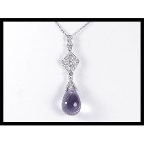 Elegant pendant with 32 side diamonds that weigh approximately 0.15 carats and 1 amethyst that weighs approximately 6.60 carats set in 18K white gold. The pendant measures 41 millimeters (1-5/8 inches) long x 10 millimeters (3/8 inches) wide and weighs 3.00 grams total weight. The pendant does not come with the chain.