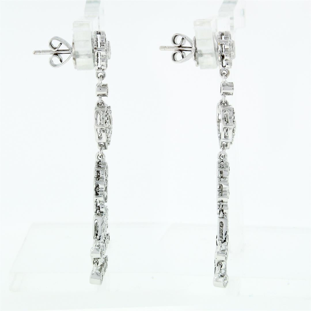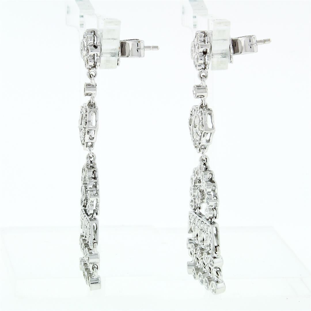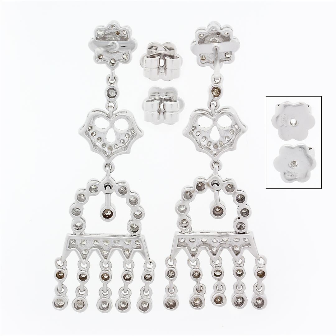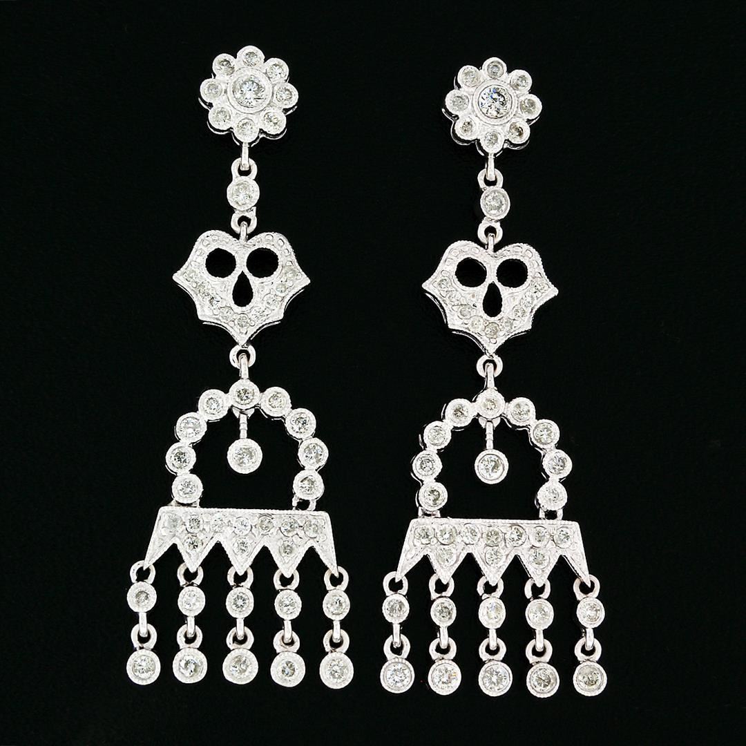 A pair of solid 18k white gold chandelier dangle earrings, with 98 round brilliant cut natural diamonds ( G/H - SI1/SI2 ; 1.35ctw). The earrings measure approximately 45.76x14.50mm and weigh a total of 8.57 grams.
