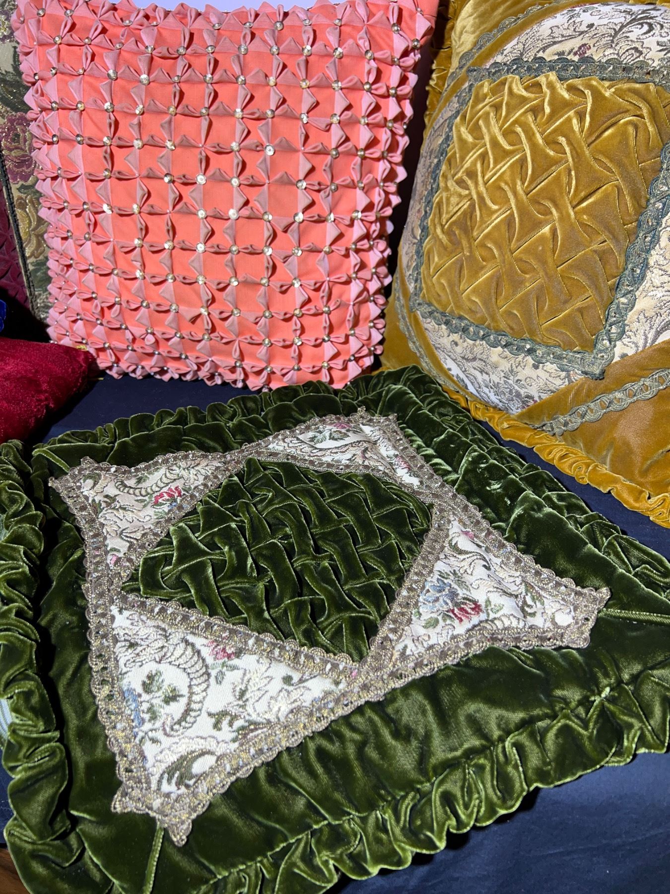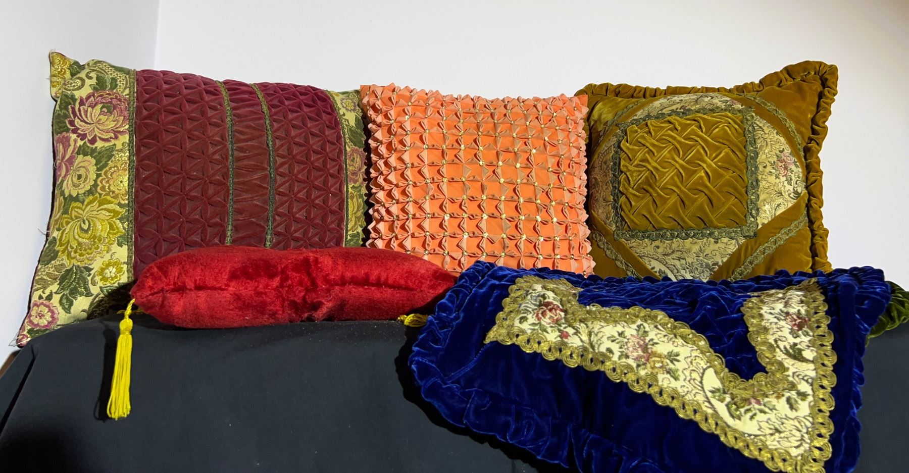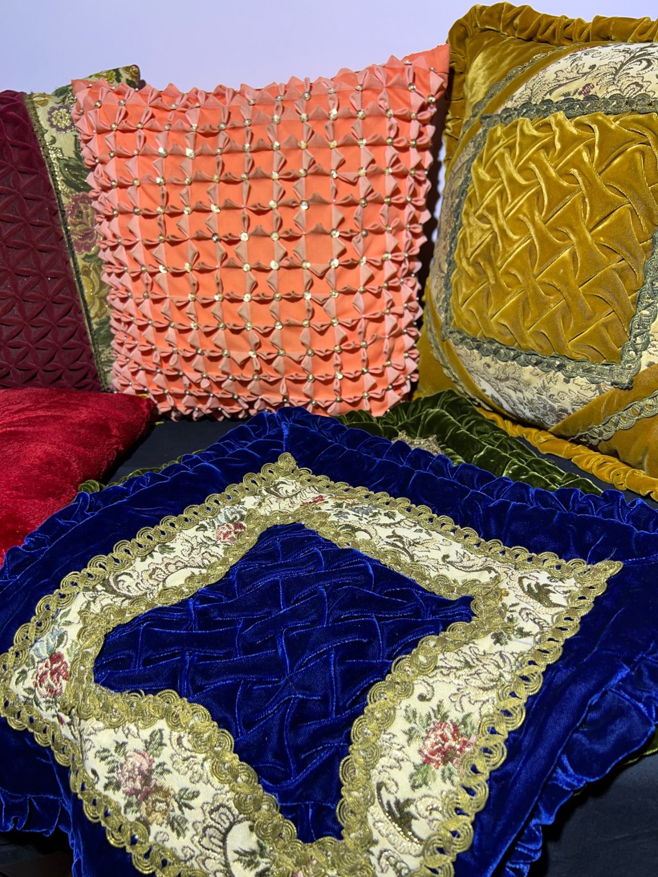 Includes four pillows and two covers, The covers are 16x16", the largest pillow is 19x14"