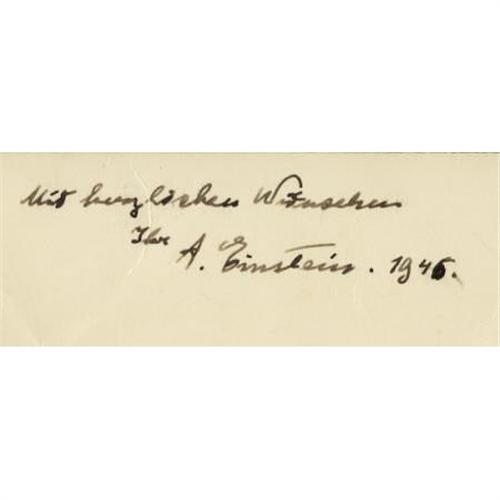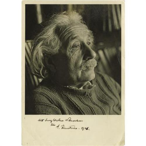 <B>Signed and Dated Albert Einstein Photograph Taken by Noted Fashion Photographer Herman Landshoff</B></I> S.P. <I>"A. Einstein. 1946",</B></I> a 5" x 7" black and white image signed in the lower white margin with a sentiment in German. The image has been identified by the Albert Einstein Archives as being taken by Herman Landshoff in 1945 during a session held at Einstein's home at 112 Mercer Street in Princeton, New Jersey. Although known primarily for his fashion photography, Landshoff's impressive portfolio includes memorable portraits of powerful intellectual and creative icons from his time, including Robert Oppenheimer, Alfred Stieglitz, and Ansel Adams. Although Landshoff's aesthetic relied on the use of motion in his shots, he has taken a very different approach in this instance. Einstein is posed and captured in a moment of reflection, all movement relies solely on the pattern of texture and light across the image. The image has a small areas of silvering at top, and few light creases primarily in the margins; however it remains striking and very displayable.<BR><BR><b>Shipping:</b> Flat Material, Small (<a target="_blank" href="http://www.heritageauctions.com/common/shipping.php">view shipping information</a>)