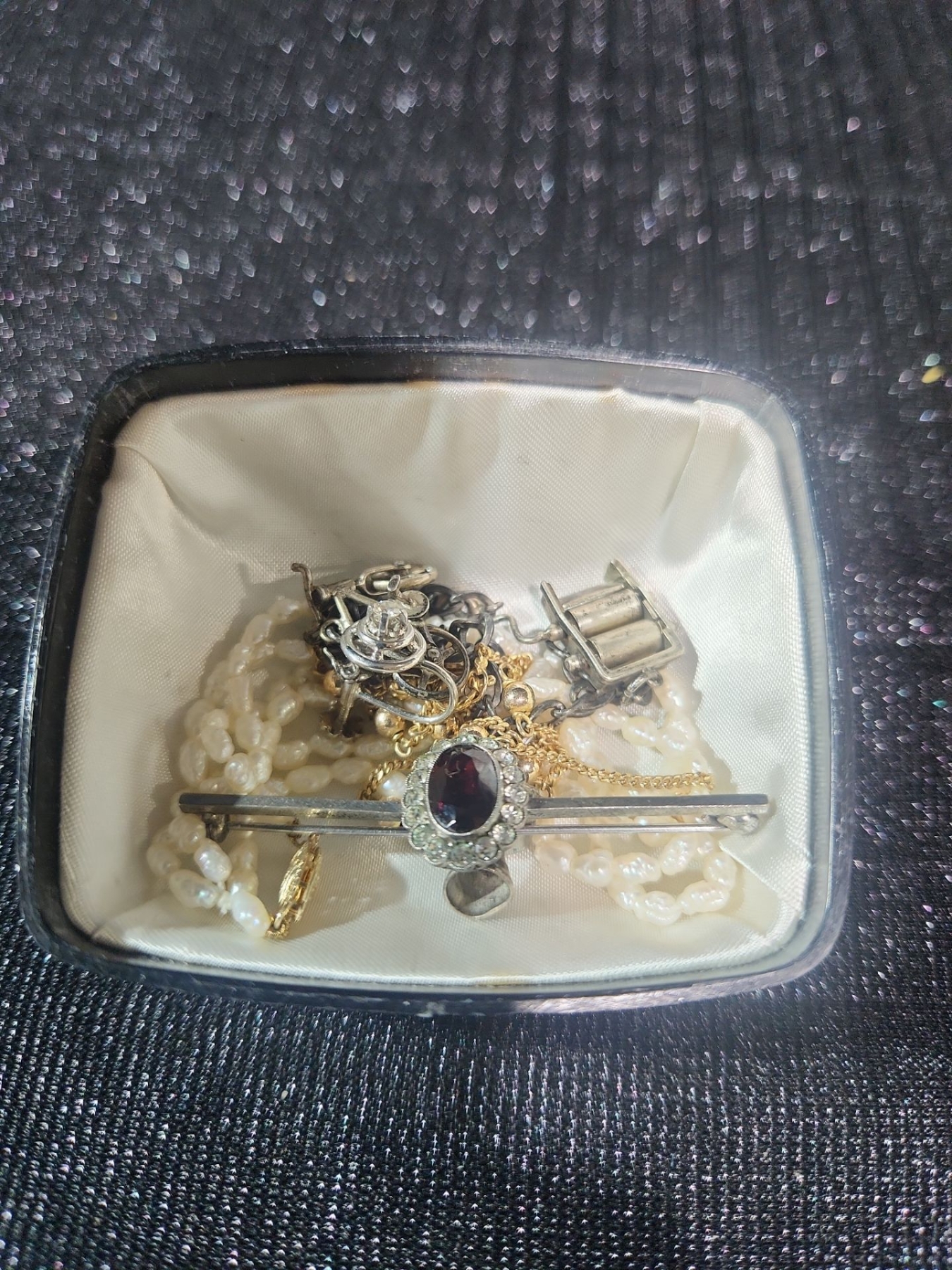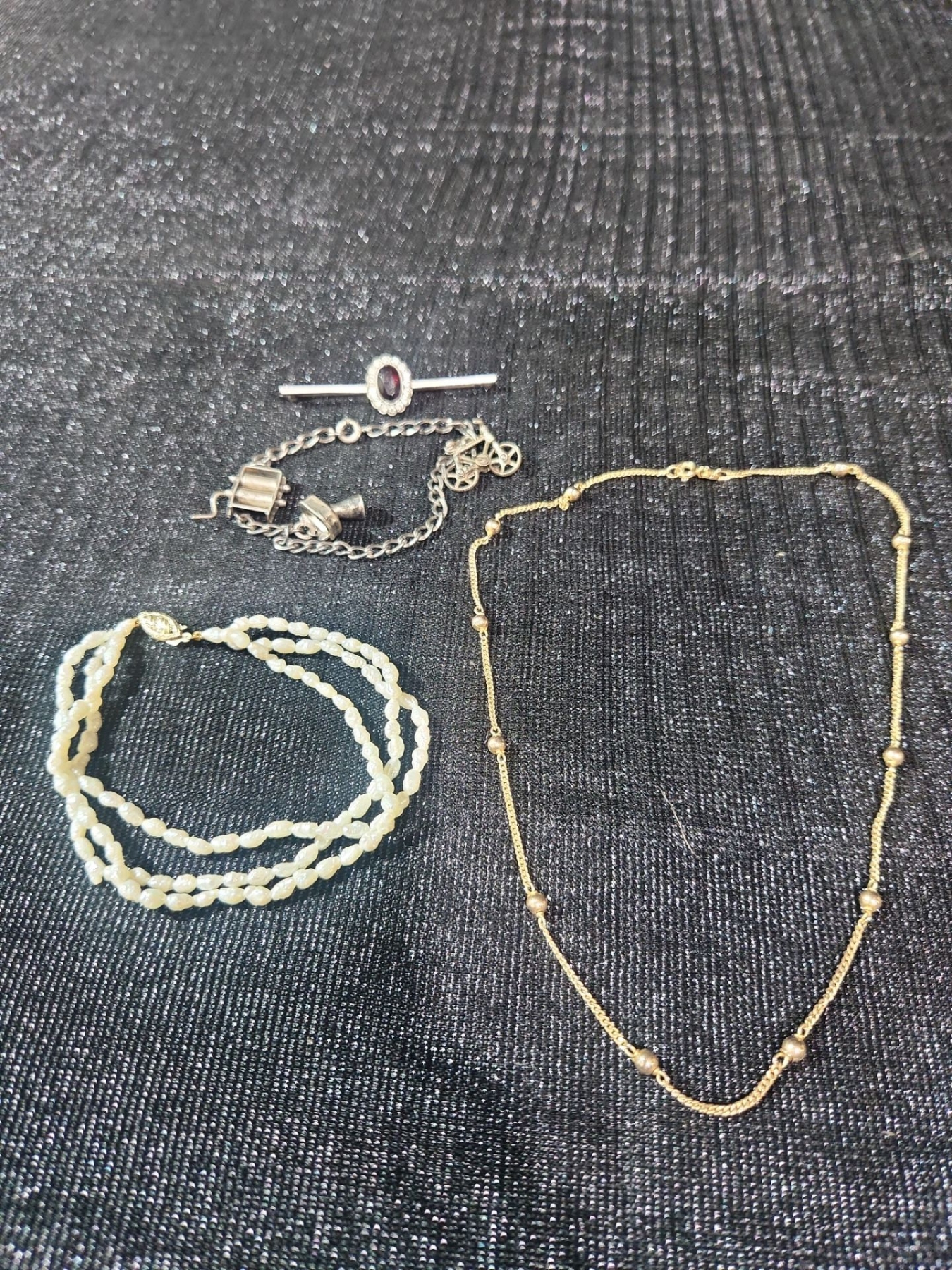 With this lot, you will receive 2 bracelets, a choker style necklace and a brooch! Lovely assortment for your own collection or perhaps to gift to a loved one. The charm bracelet has some lovely little charms.