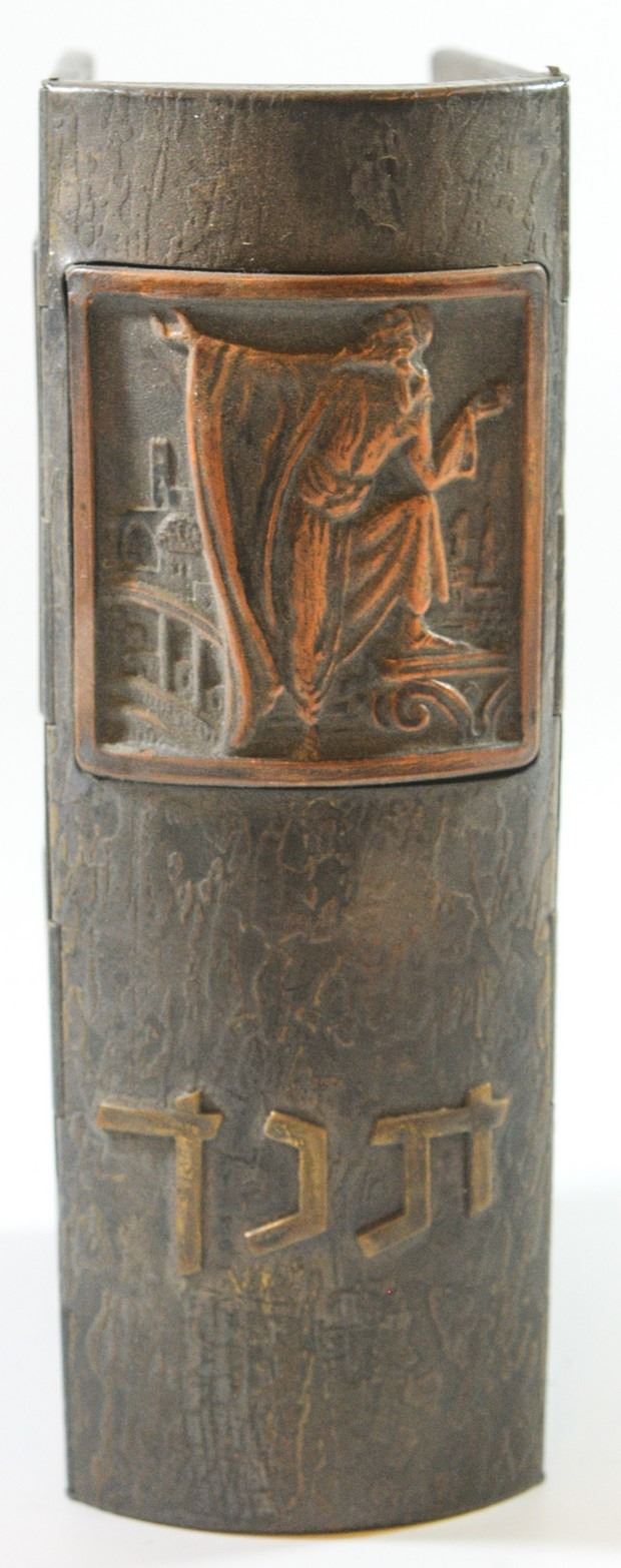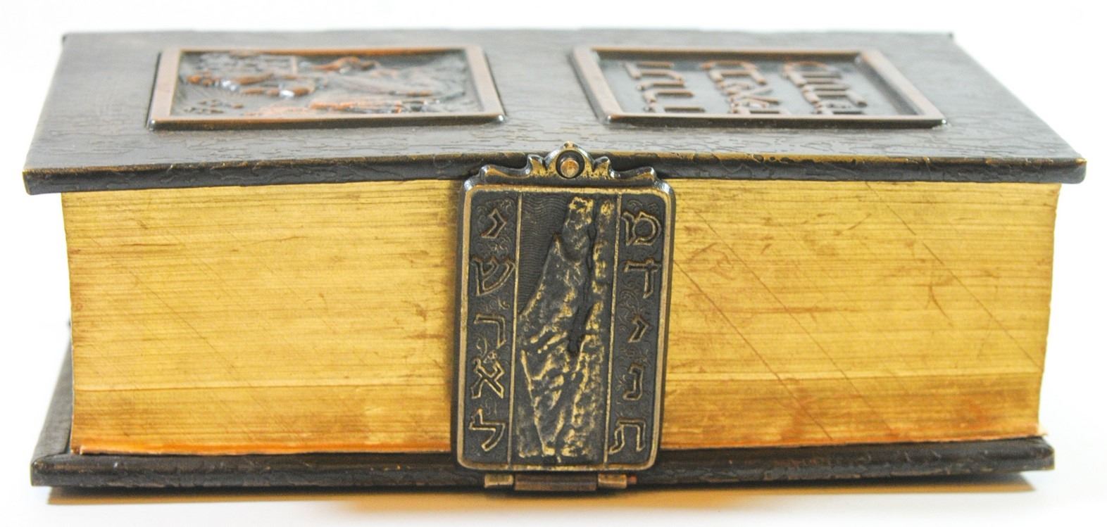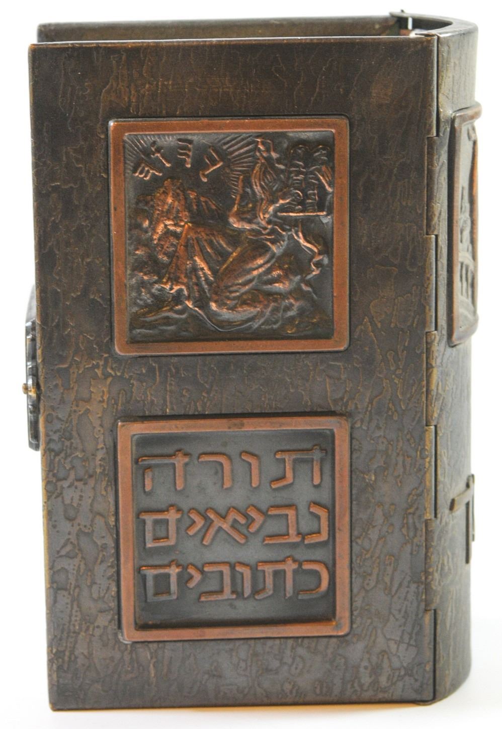 Elegant Bible with brass binding by Pal Bell , 1950s. Binding decorated with reliefs of a Sofer, Moses with the Tablets of Stone and a map of Israel. The Bible was published by Sinai Press, Tel Aviv. Edges of pages are gilt. Dimensions: 17X12X5.5 cm. Dedication describing the book as a 1954 gift from a Jerusalem family.