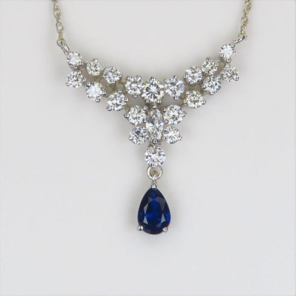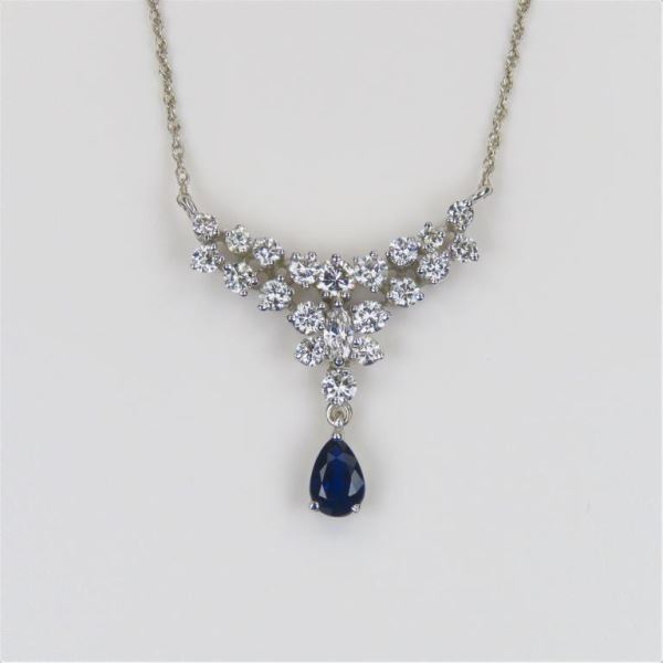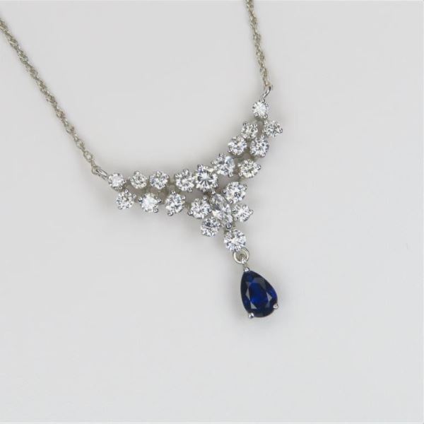 featuring a pear shape Blue Sapphire weighing approx. 0.75 carats accented with over 20 round Diamonds weighing approx. 1.00 carat with F-G colors and VS clarity set in a charming 14 karat white gold necklace.