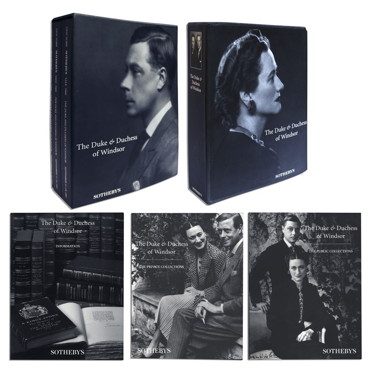 Boxed set of catalogs from the Duke & Duchess of Windsor auction, held by Sotheby's from 11-19 September 1997 in New York. Complete set of 2 first and only edition catalogs are bound in softcovers and housed in a photographic slipcase. Set is accompanied by a third book, a spellbinding 61pp. photo-illustrated biography of the Duke and Duchess, complete with a diagram of the genealogy of H.R.H. The Duke of Windsor, a glossary of terms, timeline of the unlikely couple's lives and bibliography. Volumes are subtitled, ''The Public Collections'' and ''The Private Collections''. Among the items featured in the public collections volume are photographs of the couple, medals, furnishings and household accoutrements from their Paris residence. Private collection comprises such personal effects as Wallis Simpson and Edward's exquisite wardrobe, jewelry and articles bearing their cyphers as Duke and Duchess, as well as their ribbons and trophies from equestrian and canine hobbies. Set measures 12'' x 9.25'' x 3''. Bumping to corners of slipcase at open edge, else fine. A fascinating set illustrating the backdrop to the legendary royal romance.