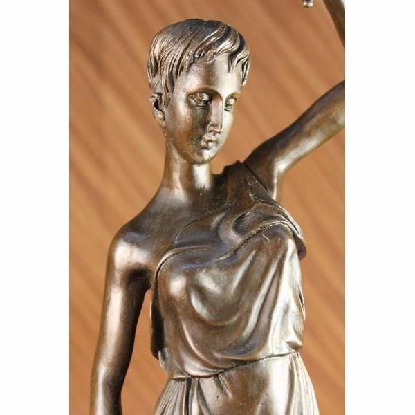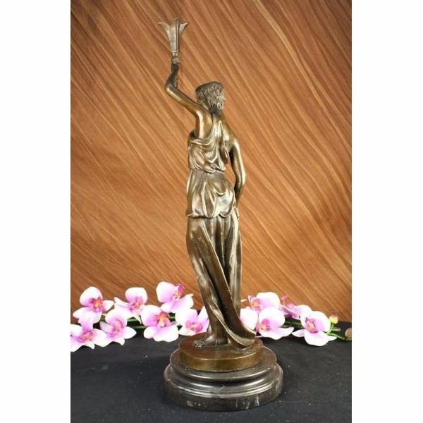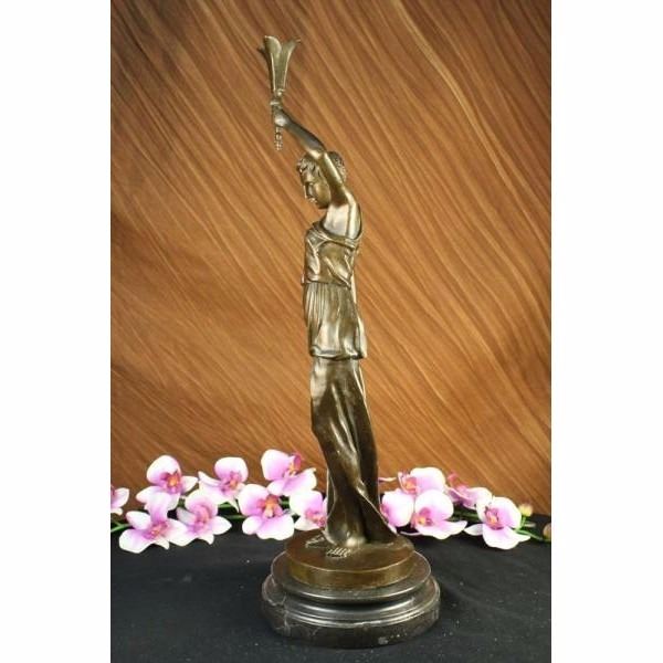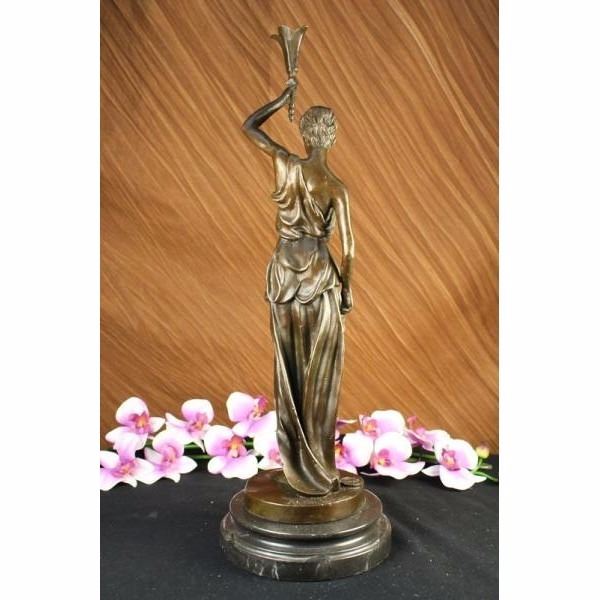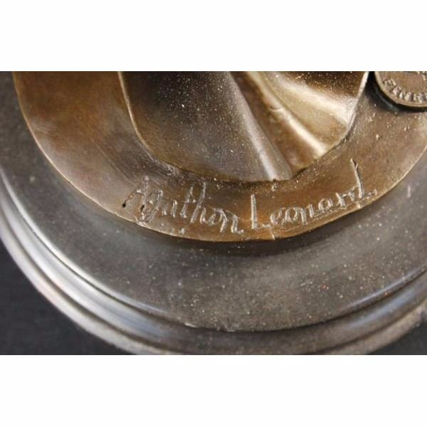 This solitary woman stand with a long dress that hangs all the way to the floor exposing nothing but her right shoulder. Her dress has a slit on the left side showing her leg, she looks lonely and sad as she looks a little down, but that wont stop her from being the strong woman that she is. The dress she wears has this bulge up look to the front of it but its very nice and tasteful, on her left hand she hold a lamp type of torch. This piece of art would lovely for an office space or home. Handmade of solid 100% bronze and cast using the ancient "Lost Wax Method". Has a two tone brown patina that sits upon a solid black marble base. Signed Agathon Leonard. Condition: This sculpture is in perfect condition. Bronze Dimensions with Marble Base:Height 20" x Width 7" Marble Dimensions: Diameter 7" Height without base: 19" Weight : 13 LBS Inventory 79-X2042B4897