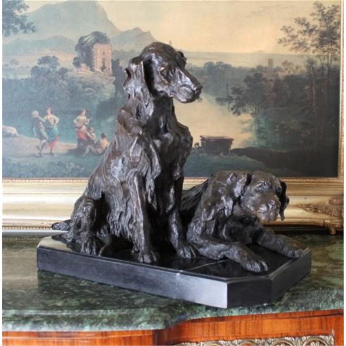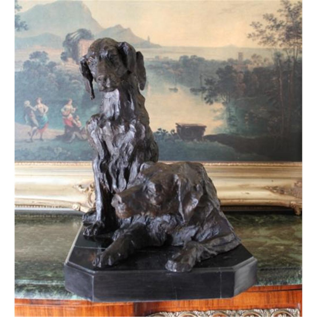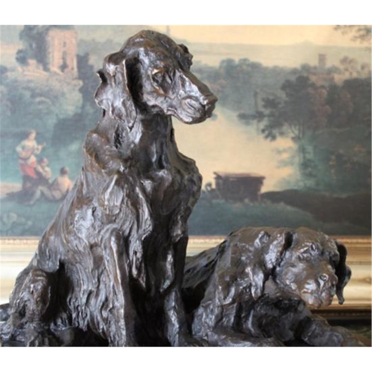 Pair of Retriever Dogs Bronze Sculpture, 15"H x 17"L x 10"D 46 lbs. This bronze sculpture was produced using the "Lost Wax" casting method. The"Lost Wax" Cast method is the most precise metal casting technique in existence, ensuring exquisite detail of the original host model which is usually sculpted in clay or wax. This "Lost Wax" casting method is an extremely labor intensive and expensive process, but the end results produce a Heirloom Quality Masterpiece!