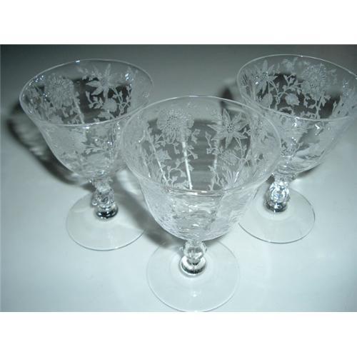 This is a Group of three Elegant Depression Glass Wine Stems by Cambridge Glass. The Pattern is Wildflower and is very collectible. They hold 4-1/2 ounces and are 4-1/2" tall. The color is Crystal. These are lovely stems!