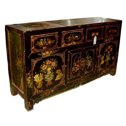The antique furniture is a piece of exquisite chinese Qing dynasty's sideboard made of wood gathered from Hebei province in China.A wonderful piece for a room that can hold it.At the beginning of the Qing Dynasty, furniture followed Ming patterns and styles.Qing Furniture showed its own uniqueness with the absorption of western art. It was larger in size with grandeur and pageantry.Engraving was a popular and important means of furniture decoration. The subjects range from auspicious character patterns, to geometric patterns and scenes in nature with animals, mountains and waters, flowers and grass. Color painting, especially gold painting, was widely used.Commercial symbols emerged, such as patterns concerning money and fortune.To later Qing furniture has less engraving ,instead ,inlays of stone, which catch the eye more easily than exquisite engraving, are used to tell of the luxurious lifestyle of the owner. In addition, color and gold painting become the vogue depicting the preference for gaudiness by the wealthy.