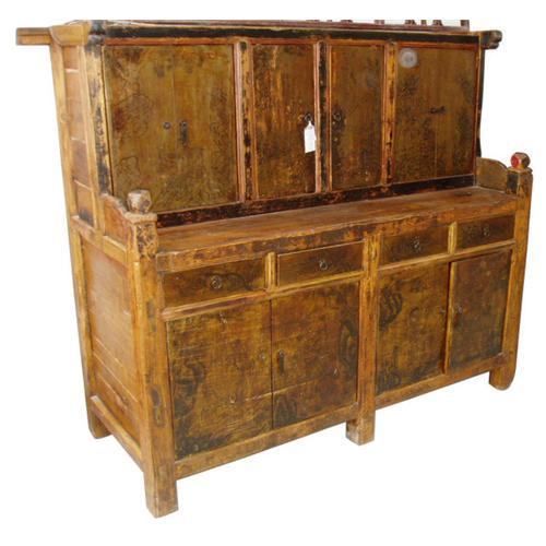 The antique furniture is a piece of exquisite chinese Qing dynasty's lacquer sideboard made of wood gathered from Shanxi province in China.A wonderful piece for a room that can hold it.At the beginning of the Qing Dynasty, furniture followed Ming patterns and styles.Qing Furniture showed its own uniqueness with the absorption of western art. It was larger in size with grandeur and pageantry.Engraving was a popular and important means of furniture decoration. The subjects range from auspicious character patterns, to geometric patterns and scenes in nature with animals, mountains and waters, flowers and grass. Color painting, especially gold painting, was widely used.