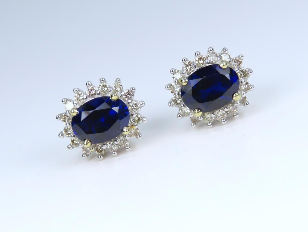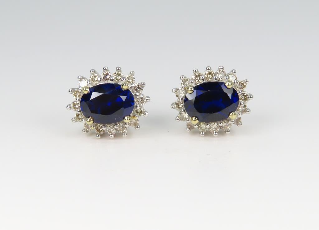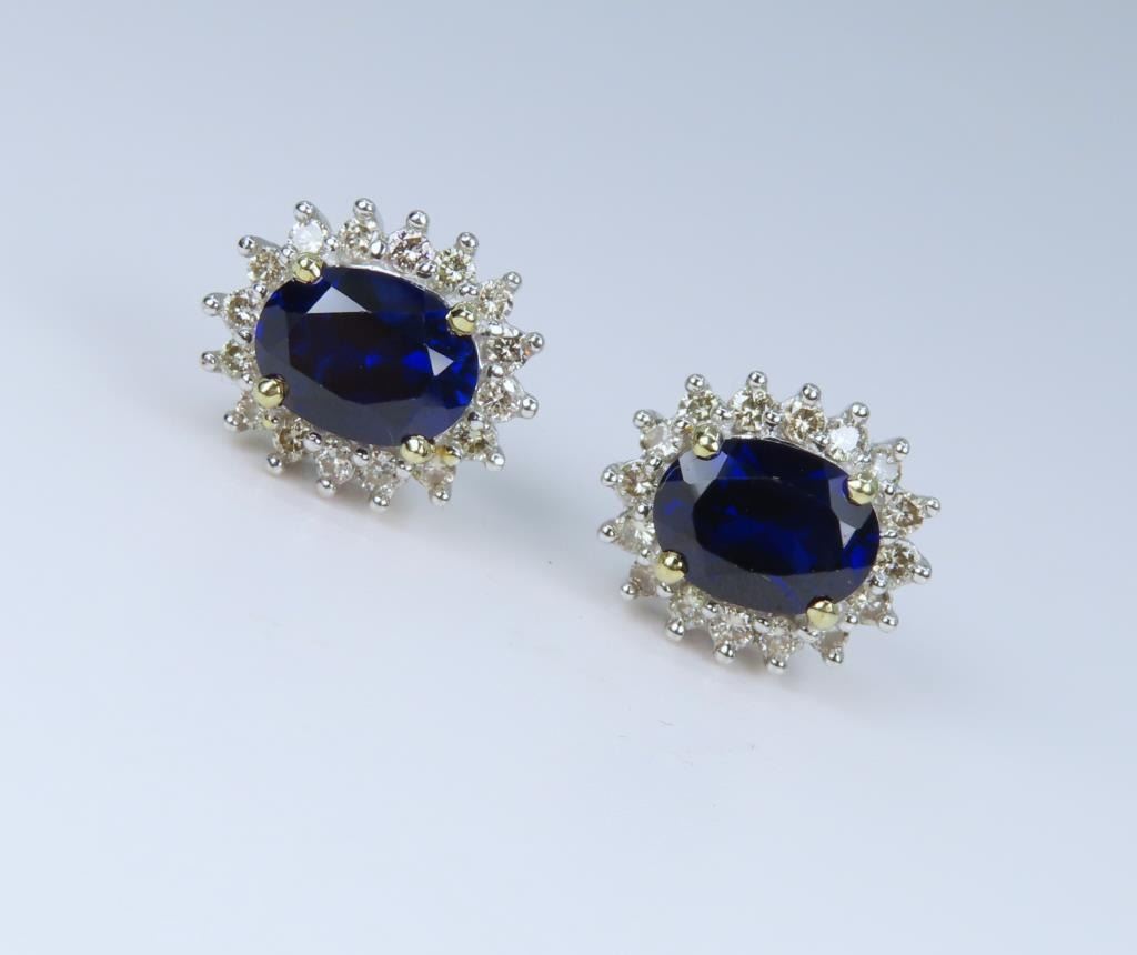 and Diamond Earrings, featuring 2 oval cut lab created Blue Sapphires weighing approx. 3.00 carats total and encircled with 16 round Diamonds weighing approx. 0.40 carats with H-I colors and VS-SI clarity, set in 10 karat yellow gold setting.