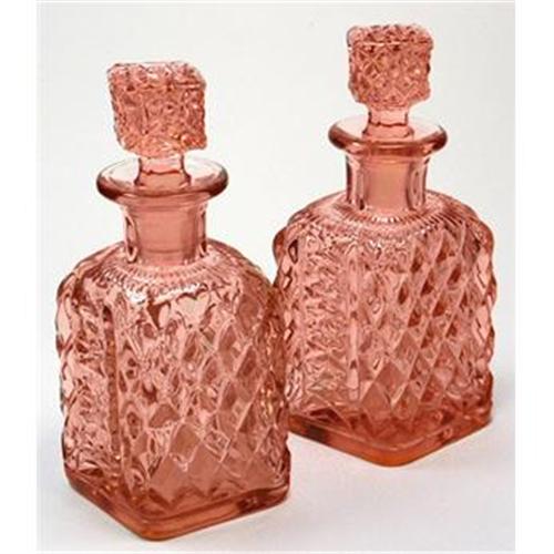 </font></strong>Produced during the 1930s, this pair of Elegant pink Depression glass perfume decanters, lotion bottles or vanity bottles each measure 6 inches tall with their matching stoppers x 3 1/4 x 2 3/4 inches. They have not only a diamond shape but are both pressed with an intricate dimond pattern with matching stoppers. They are heavy glass, very well made and well suited for a high end vanity bottle display. Both are in excellent condition </font>