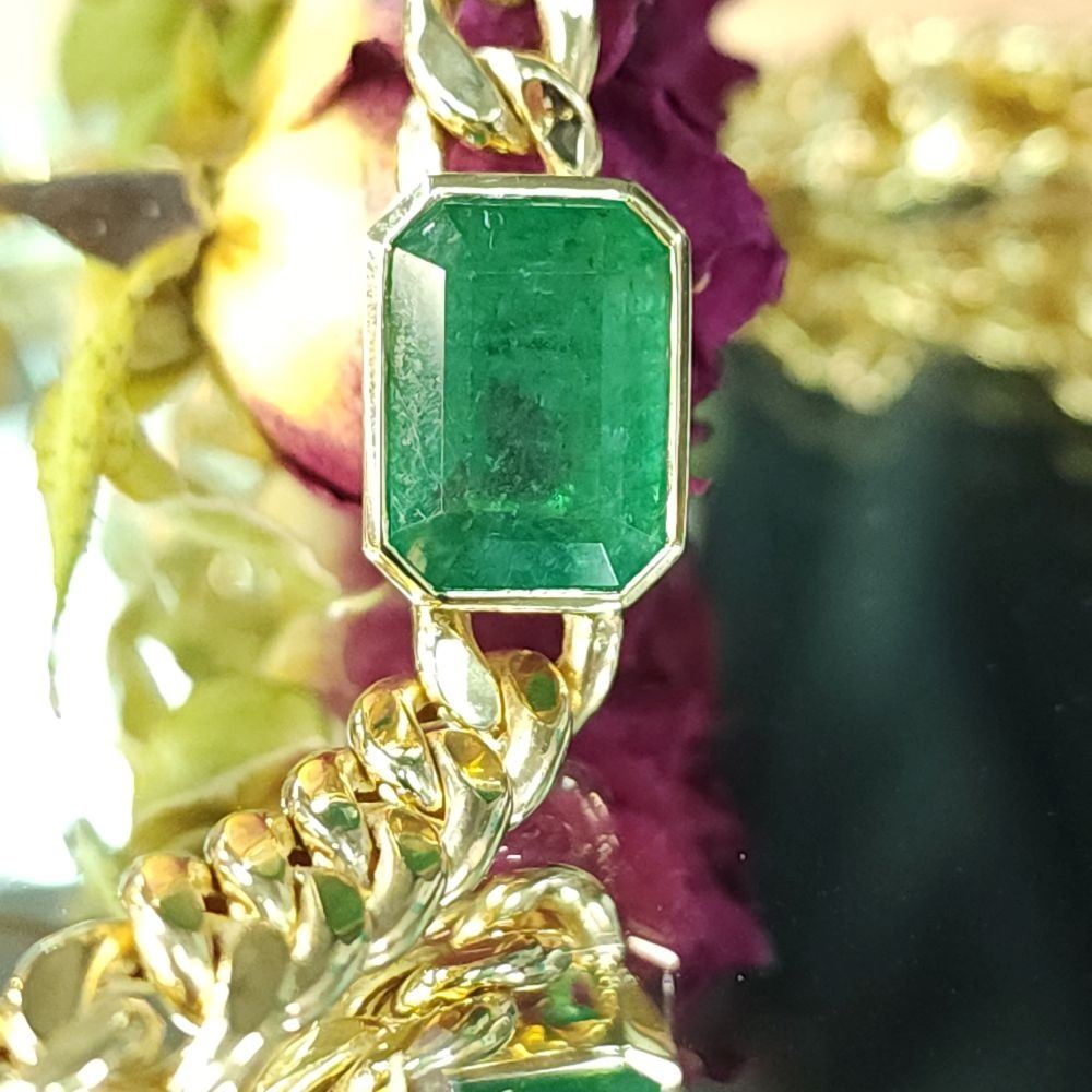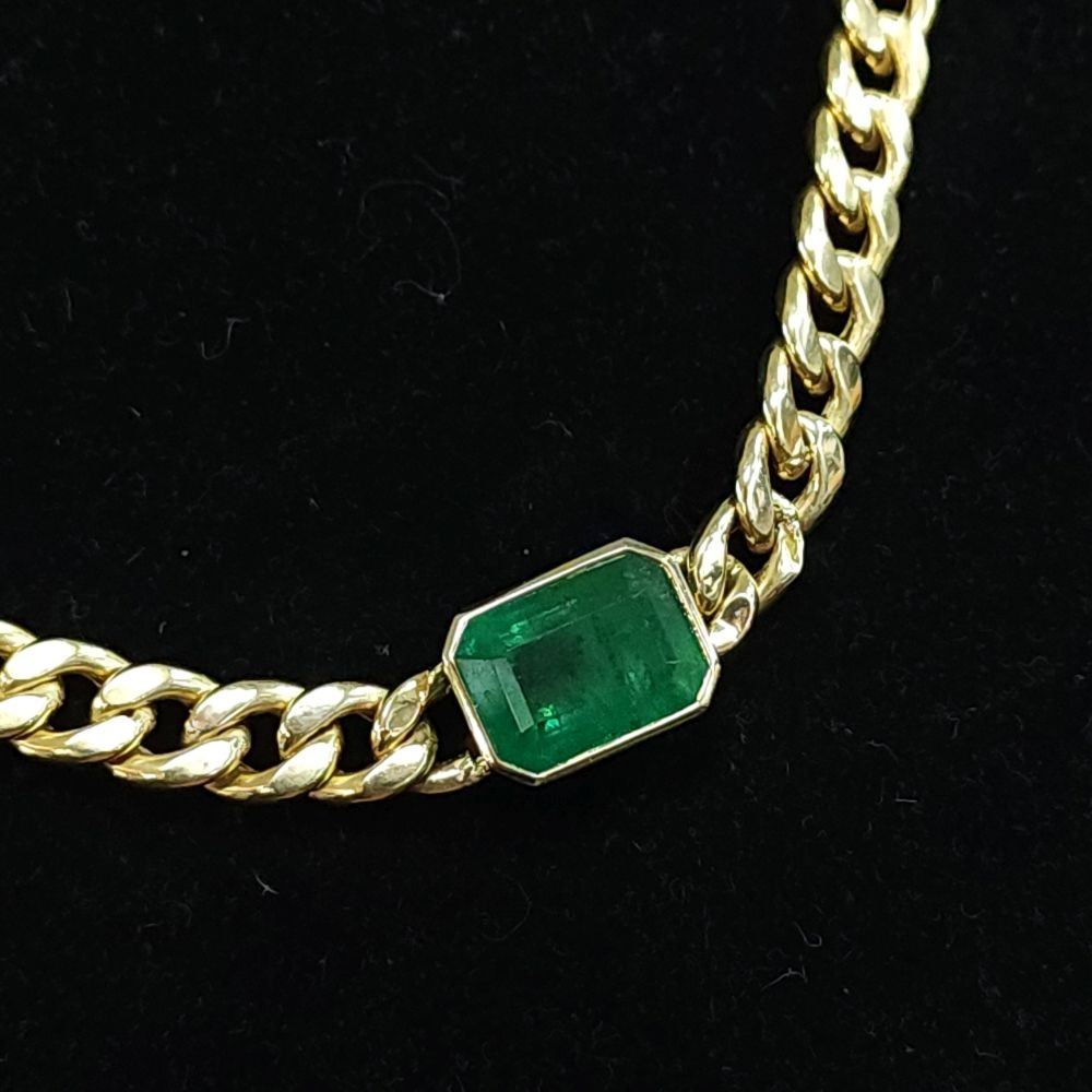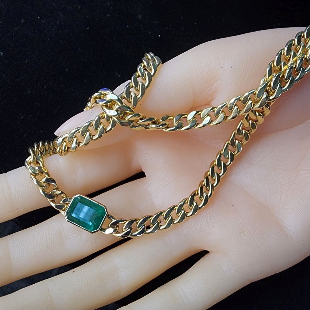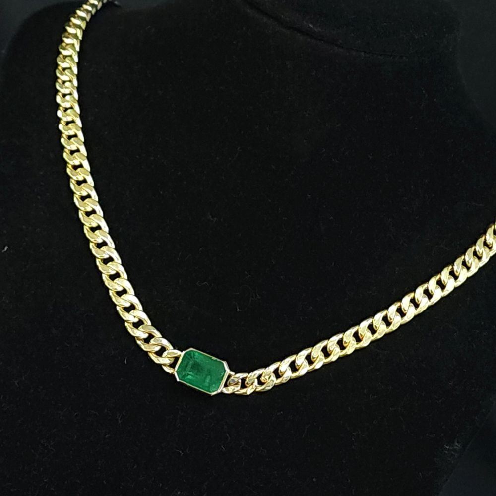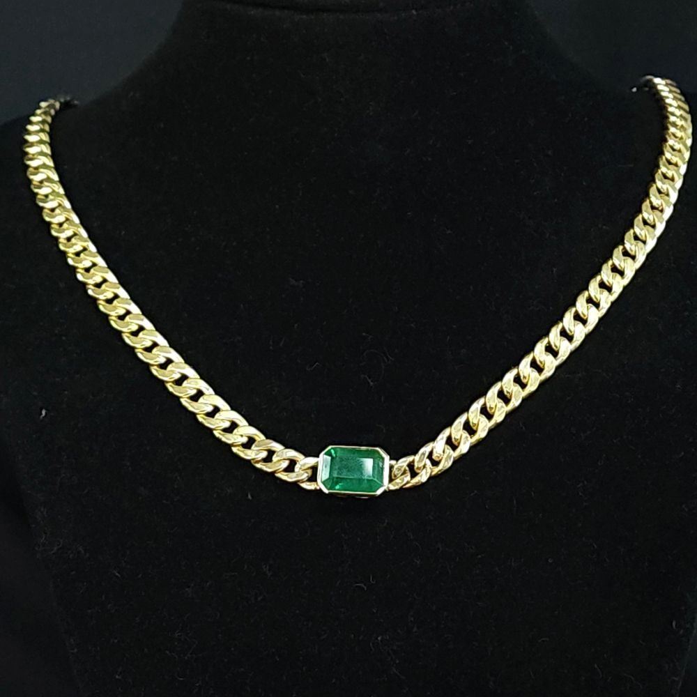 Genuine Emerald Necklace.& nbsp; This necklace shows that less is certainly more!& nbsp; A single gemstone, an amazingly gorgeous green 4.87 carat emerald-cut emerald is bezel-set& nbsp; and centered in a 14 karat yellow gold curb link chain.& nbsp; The emerald is static (does not slide along the chain) and has trussed side galleries and a ribbed under gallery for support.& nbsp; The setting bears the Oscar Friedman hallmark. The chain is 18& quot; long and approximately 6.5 mm wide.& nbsp; It is lightweight, hollow, easy to wear.& nbsp; The chain has a lobster clasp for closure.& nbsp; This necklace is certified and appraised for& nbsp; $21,640.00 estimated retail replacement value.