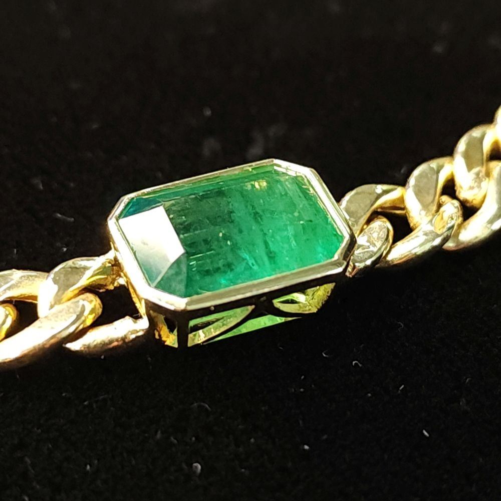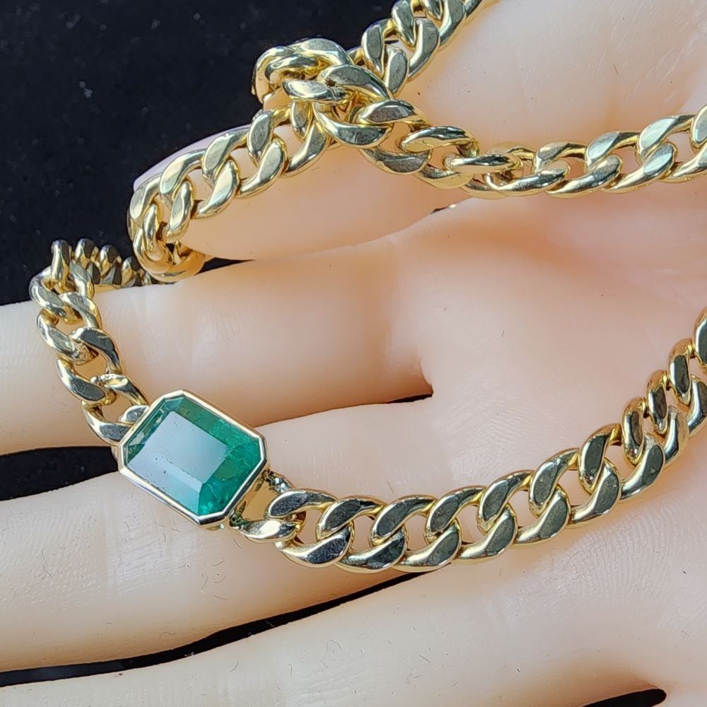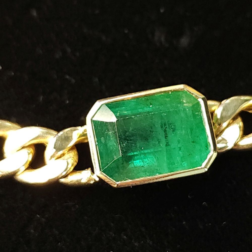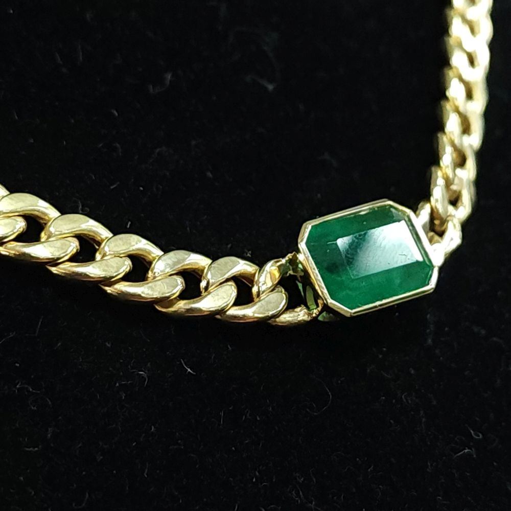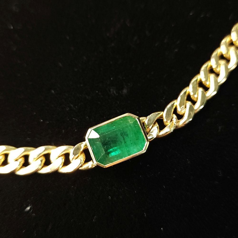 Genuine Emerald Necklace.& nbsp; This necklace shows that less is certainly more!& nbsp; A single gemstone, an amazingly gorgeous green 4.87 carat emerald-cut emerald is bezel-set& nbsp; and centered in a 14 karat yellow gold curb link chain.& nbsp; The emerald is static (does not slide along the chain) and has trussed side galleries and a ribbed under gallery for support.& nbsp; The setting bears the Oscar Friedman hallmark. The chain is 18& quot; long and approximately 6.5 mm wide.& nbsp; It is lightweight, hollow, easy to wear.& nbsp; The chain has a lobster clasp for closure.& nbsp; This necklace is certified and appraised for& nbsp; $21,640.00 estimated retail replacement value.