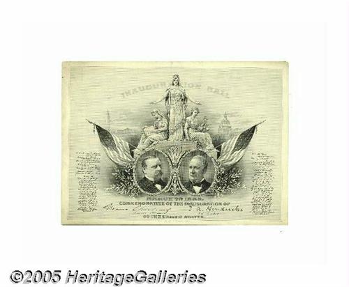 <B>Elegant Engraved Invitation to the 1885 Cleveland - Hendricks Inaugural Ball</B></I> Magnificent quality by V. G. Fischer, Washington D.C. These beautiful invitations are avidly sought by political and inaugural item collectors alike. Excellent condition. 9.5" x 6.75". Lot:259