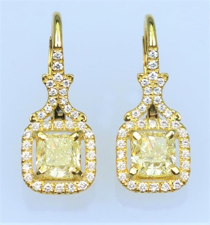 Elegant Fancy Yellow and White Diamond Earrings featuring two matching Radiant Cut Diamonds weighing 2.10 carats total with light Fancy Yellow colors accented with 66 round Diamonds weighing approx. 1.00 carattotal with G-H colors and VS clarity with a combined Diamond weight of approx. 3.00 carats set in 14 karat yellow gold custom made settings. Retail $12,000-$15,000 Estimates $6,000-$9,000