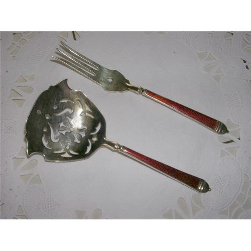 This delicate condiment set consists of a pickle fork and fancy slotted spoon done in a rich gold wash over sterling. The handles have an burnt amber inlay front and back. It is stamped sterling on the back along with other copyright marks. Both pieces measure about 4-1/2 long. FREE shipping within the USA. Insurance extra.