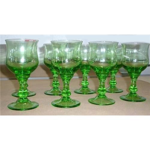 <table width="100%" border="0" cellspacing="0" cellpadding="4"><tr><td><em> </em></td></tr><tr> <td width="100%"> Set of eight (8) gorgeous glowing green elegant glass water goblets feature flared bowls and sculpted stems. They each measure 7 1/4" tall x 3 1/2" across the rim, and are all in excellent condition. </td></tr><tr> <td> </td></tr><tr> <td>Reference #: tsG8EDGGS</td></tr><tr><td>Condition:Excellent</td></tr><tr><td>Year:1930s</td></tr><tr><td>Title:Elegant Green Glass Flared Goblet Set (8)</td></tr><tr><td>Location:Orlando, Florida</td></tr></table>