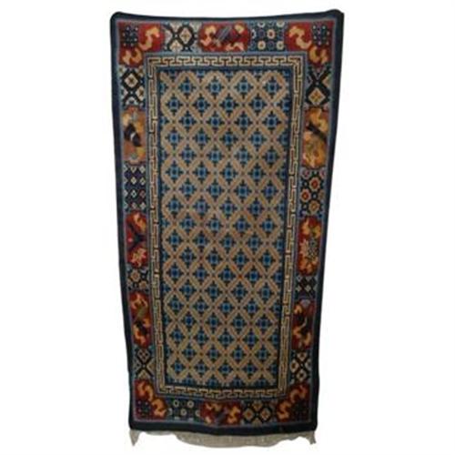 The item is a exquisite pure wool rug with geometrical pattern handmade in Tibet.Rugs and carpets are basic necessities in the Tibetan daily life.The high quality hand spun,vegetable dyed look,and the primitive but highly stylized patterns greatly appealed to westerners.Typically made for use as mats to sit on or for meditation,door and window covers,horse saddles,bed covers and pillar wrapping,the traditional Tibetan weaving generally reflect traditional Tibetan culture and religion.However, Chinese designs were also dominant as seen in the display of dragons,phoenix,clouds, floral and lotus images.