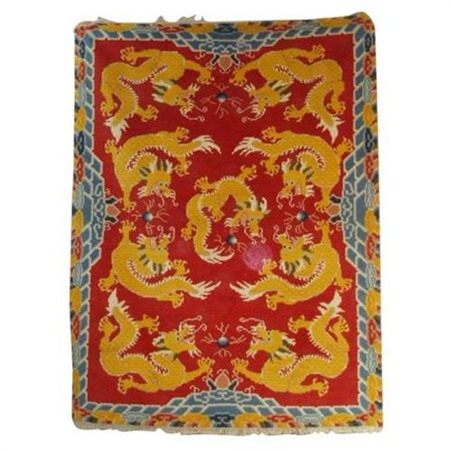 The item is a exquisite pure wool rug with beautiful dragon pattern handmade in Tibet.Rugs and carpets are basic necessities in the Tibetan daily life.The high quality hand spun,vegetable dyed look,and the primitive but highly stylized patterns greatly appealed to westerners.Typically made for use as mats to sit on or for meditation,door and window covers,horse saddles,bed covers and pillar wrapping,the traditional Tibetan weaving generally reflect traditional Tibetan culture and religion.However, Chinese designs were also dominant as seen in the display of dragons,phoenix,clouds, floral and lotus images.