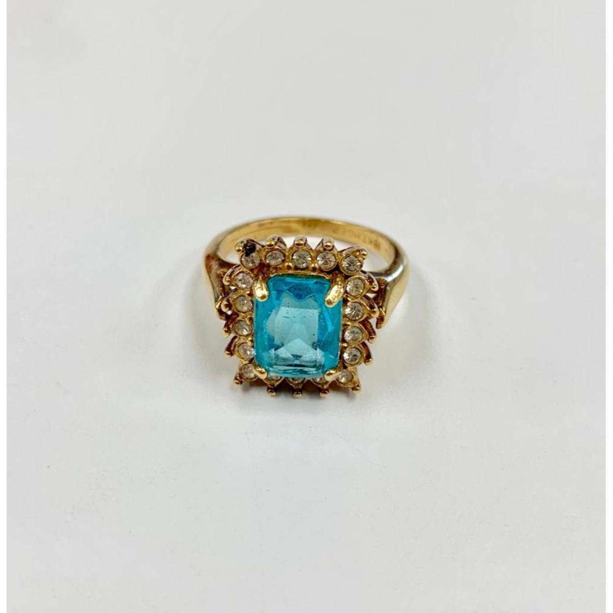 This precisely crafted ring is set with a rectangular faceted ocean blue citrine stone, and is surrounded by lustrous round cut crystals. A must have symmetrical masterpiece for any collector or wearer of fine jewlery. Please see photos for further details. Â