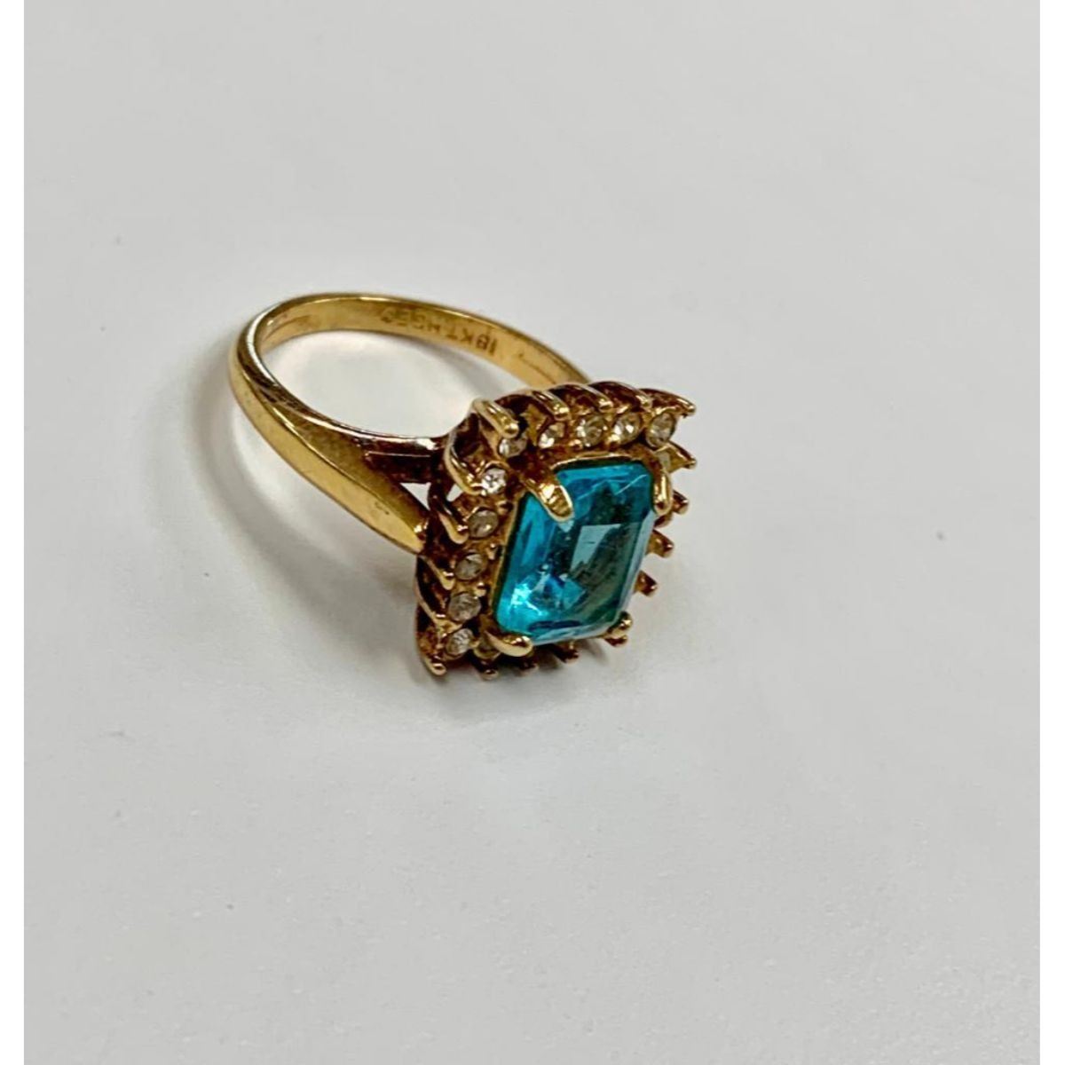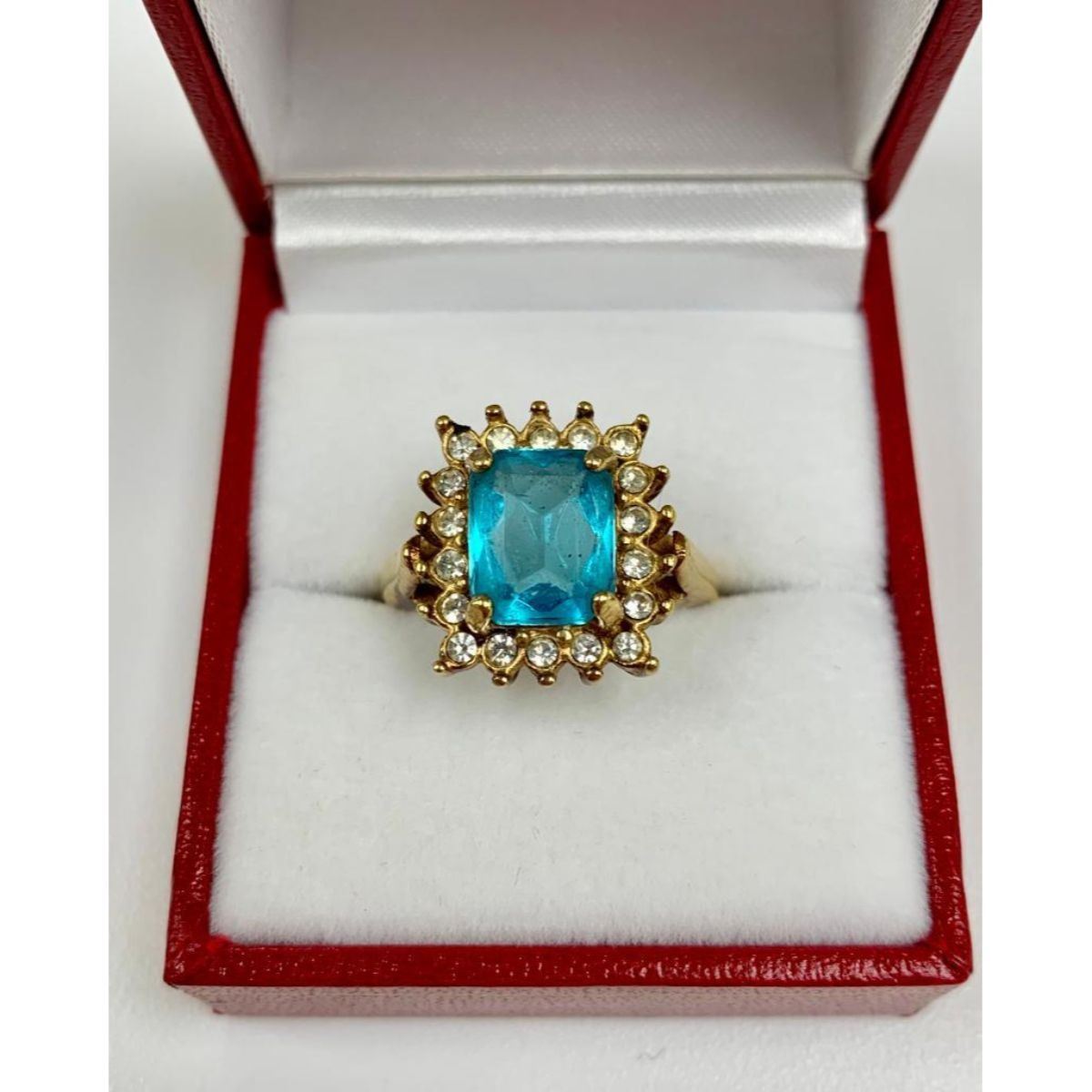 This precisely crafted ring is set with a rectangular faceted ocean blue citrine stone, and is surrounded by lustrous round cut crystals. A must have symmetrical masterpiece for any collector or wearer of fine jewlery. Please see photos for further details. Â