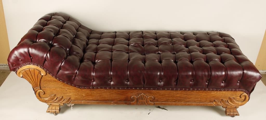 Carved, appliqued sides and feet with scroll designs. Tufted wine colored naugahyde. Measures 79"x32"x27"(at highest point).