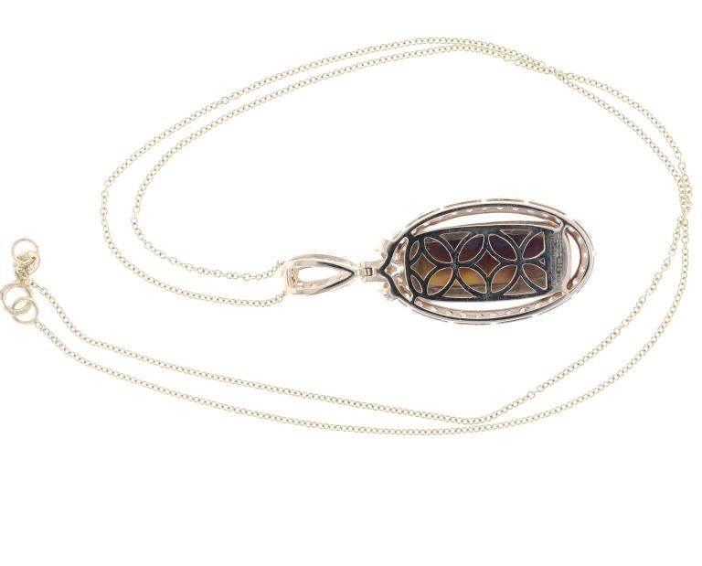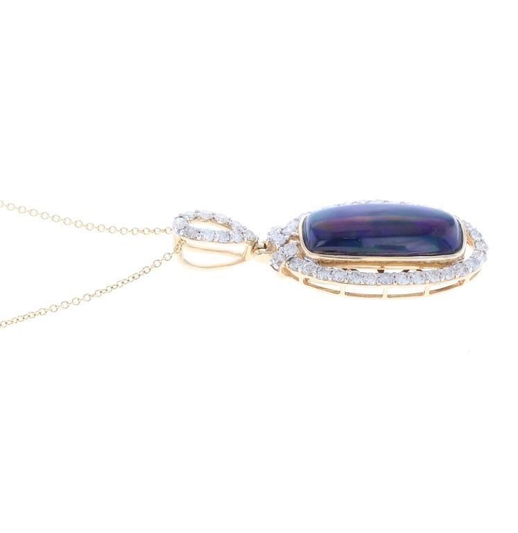 Featured in this lot is this elegant opal diamond and 14k yellow gold necklace with GAL paperwork. The necklace is wonderfully and professionally crafted 14k yellow gold construction that features a marking on the flat link of the necklace 'fancy' and reads '18k and Italy' on the opposite side of the link. The center stone is a beautiful natural black sugarloaf opal cabochon that shows a phenomenal play of colors with measurements of 19.24 x 8.11 x 4.31mm and shows black with blue and green coloration and moderate saturation and is semi transparent with a total weight of 4.34ct. The center stone and the link above is profusely decorated with a total of 44 round brilliant cut diamonds that shows a clarity of I1-I3 and a color gradient of G-H with a total diamond weight of 1.15ct. The piece comes complete with GAL(Gemological Appraisal Laboratory of America, Inc., a GIA certified lab GAL Appraisal Number#: GAL202215037) report and appraisal confirming the above info and giving a total value of $5,925.00. The measurements of this necklace from clasp to clasp is 18" and the pendant measures 1 1/2" x 3/4" x 1/4".