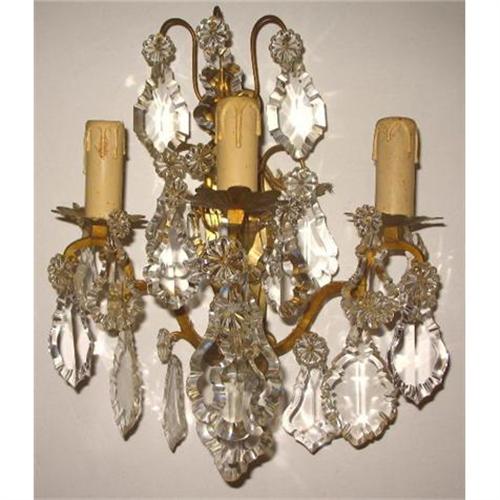 This is an absolutely gorgeous pair of sconces from France in the classic Louis XV style. This pair of wall lights is exceptional for their numerous tiers and the extremely full appearance...please note how beautifully the crystals sparkle! As a pair, they will make a strong & elegant statement in your fine interior. These sconces measure approximately 13" x 11" x 7" (deep), and they date from circa 1940.