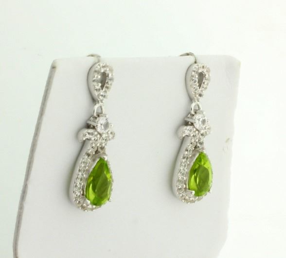 Large 5x8mm pear-shaped genuine Peridot gemstones with vibrant color surrounded by White Sapphires in a Sterling Silver mounting. Mounting has Rhodium overlay for added brilliance, and dangles measure over 1".3.3g