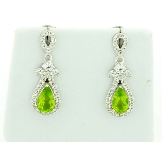Large 5x8mm pear-shaped genuine Peridot gemstones with vibrant color surrounded by White Sapphires in a Sterling Silver mounting. Mounting has Rhodium overlay for added brilliance, and dangles measure over 1".3.3g