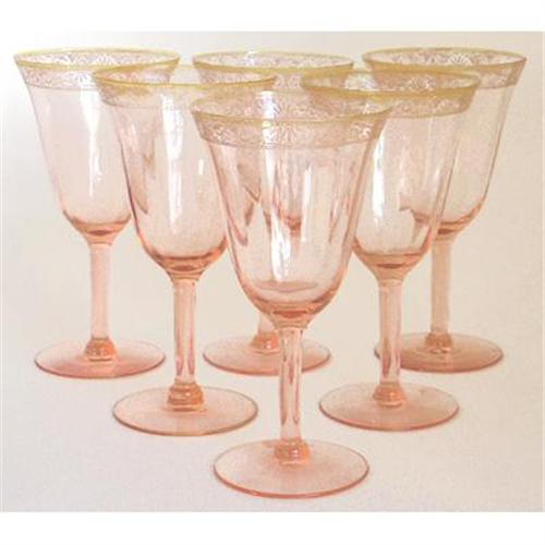 This lovely set of SIX pink Elegant Depression glass gold etched goblets have a gently flared bowl and a ribbed or panel optic design. They each measure 6 1/4" tall and have a gold Art Deco etching surrounding the rim. They sparkle brilliantly when light hits them and with the exception of wear to the gold, do to age, are all in excellent condition.