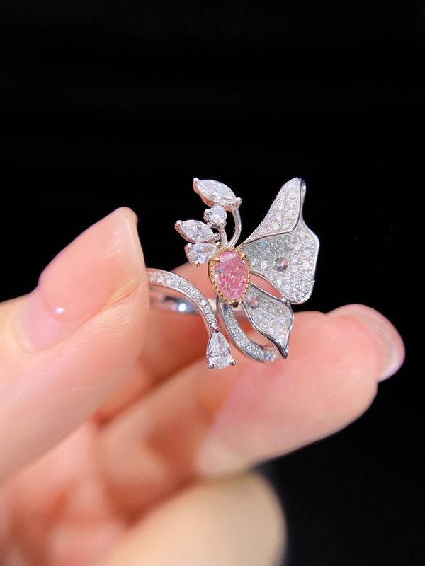 This elegant pink diamond butterfly ring features a delicate pear-shaped pink diamond at its center, surrounded by sparkling white diamonds forming graceful butterfly wings. The design captures the motion of a butterfly in flight, symbolizing freedom and femininity. The band is finely set with small diamonds, enhancing its brilliance and sophistication. Radiant yet refined, this piece beautifully expresses elegance, confidence, and timeless charm — a perfect choice for women with a noble and graceful aura.Ring size: 6, circumference: 52 mm, diameter: 16.6 mm, main diamond: 0.32 ct, side diamonds: 0.753 ct.Note: Comes with a GIA Natural Diamond Report.