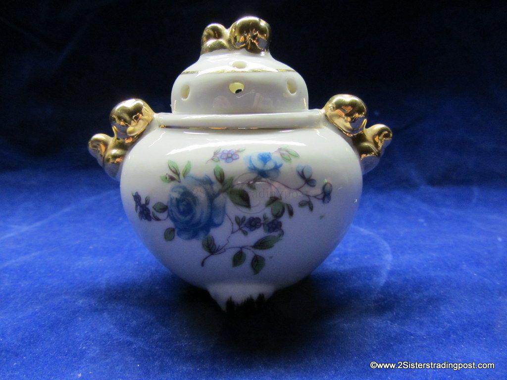 Elegant petit porcelain potpourri container. This container is very charming with blue floral design,