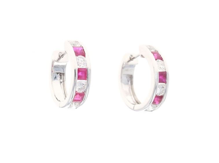 Featured in this lot is this elegant ruby diamond and 14k white gold earrings. The earrings feature a wonderfully and professionally crafted 14k white gold construction that features a a total of 6 rubies that shows a total weight of 1.26 carats. The rubies are augmented with a total of 8 round brilliant cut diamonds that shows a total weight of 0.91 carats. The condition of this pair of earrings is good with no obvious signs of damage and shows good overall condition. The measurements of this pair of earrings is 3/4" x 5/8" x 3/8".