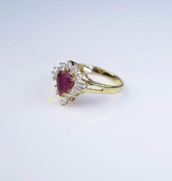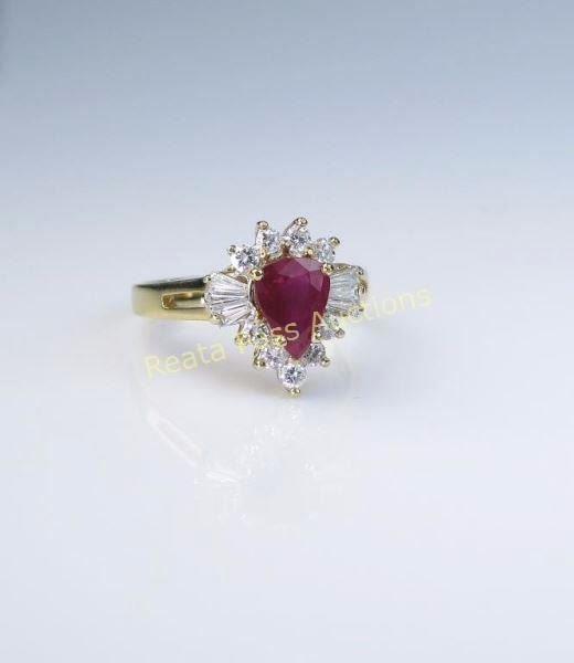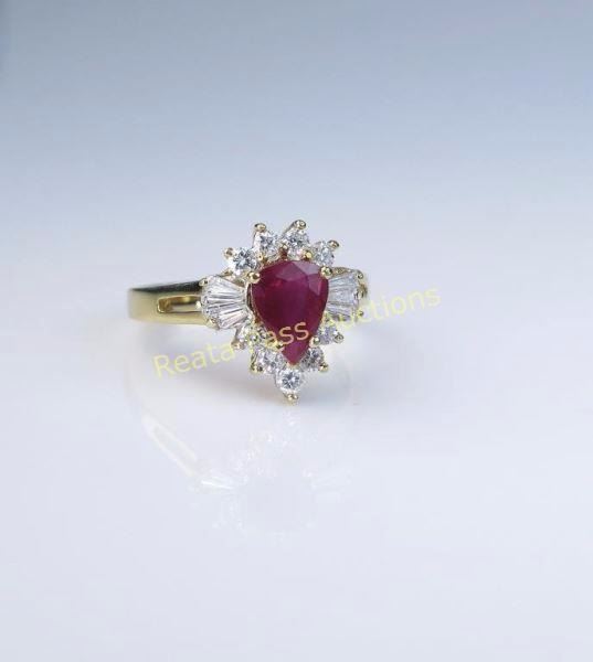 featuring a captivating 1.20 carat pear shaped ruby framed by 6 bright white baguettes and 9 round diamonds with a combined weight of 1.00 carat with F-G colors and VS-SI clarity set in 14 karat yellow gold. Retail $3,600-$4,000