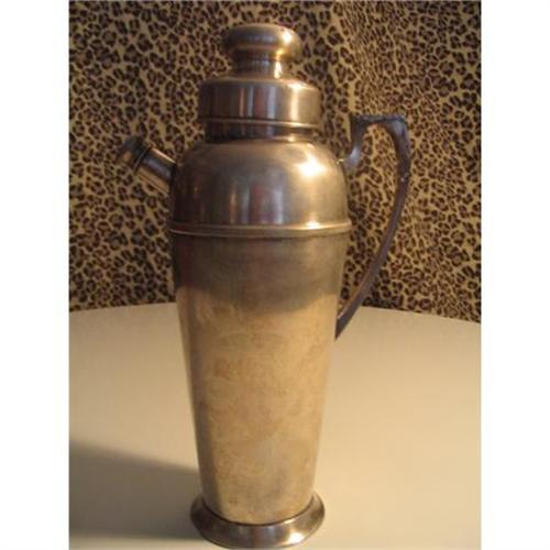 Silver Tone tall cocktail shaker with twist off spout and blunt deco style handle. 14? high, 5? wide