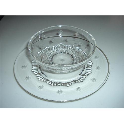 <table width="100%" border="0" cellspacing="0" cellpadding="4"><tr><td><em> Beautiful Star Etched!</em></td></tr><tr> <td width="100%"> This is elegant glass that was made during the depression. It was purchased in New Jersey in 1939. The bowl measures 5" in diameter and is 2-1/2" deep. The underplate is 8" in diameter. </td></tr><tr> <td> </td></tr><tr> <td>Reference #: 70669</td></tr><tr><td>Condition:Mint</td></tr><tr><td>Year:1939</td></tr><tr><td>Title:Elegant Star Etched Bowl and Plate Set</td></tr><tr><td>Location:Arizona</td></tr></table>